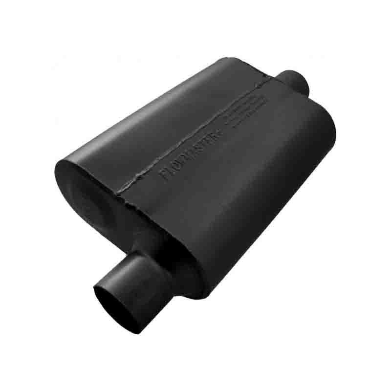 This two chamber design incorporates Flowmaster's patented Delta Flow technology. The Delta deflectors generate increased scavenging for better performance and reduced interior sound. Milder exterior tone and reduced interior resonance over Original 40 series. Constructed of 16 gauge aluminized steel and fully MIG welded for maximum durability.Features:No internal packing to blowoutExcellent Street/Strip and Off Road applicationRace proven patented Delta Flow technologyDurable fully welded 16 gauge aluminized steelSpecifications:Body Height (in): 4Body Length (in): 13Body Width (in): 9.75Fitment: UniversalInlet Connection Type: Pipe ConnectionInlet Diameter (in): 2.5Inlet Position: OffsetMaterial: Aluminized SteelMount Type: Uses New Hangers (Not Included)Muffler Series: 40 Series Delta FlowMuffler Type: ReflectionOutlet Connection Type: Pipe ConnectionOutlet Diameter (in): 2.5Outlet Position: CenterOverall Length (in): 19Shape: OvalSound Level: Aggressive Sound