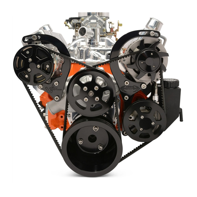 Eddie Motorsports' V Drive v-belt pulley kits for Malibu include everything to accessorize your Big Block Chevy engine. Kits come complete with all of the necessary precision CNC machined billet aluminum brackets & pulleys, which are made in the USA, as well as high quality, name brand components; Tuff Stuff aluminum water pump, Sanden compact AC compressor, Maval power steering pump with attached plastic reservoir, Powermaster 170 amp alternator. Gloss Black Anodized finish.
