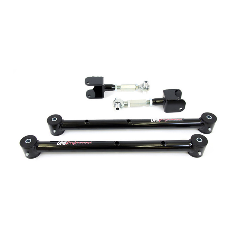 This kit includes (1) set of UMI-3015-B tubular lower control arms and (1) set of UMI-3017-B on-car adjustable upper control arms, Ultimate Arms. Both items are direct replacements of the OEM set up adding strength, ride improvement and most importantly, rear end adjustment.Kit Includes:(1) Set - UMI-3015 : Tubular Lower Control Arms(1) Set - UMI-3017 : Double Adjustable Upper Control Arms 'Ultimate Arms'