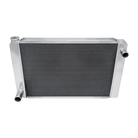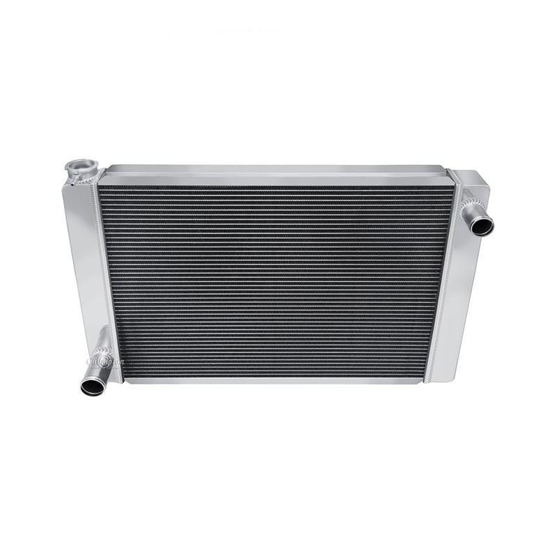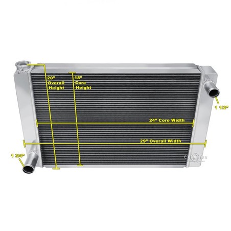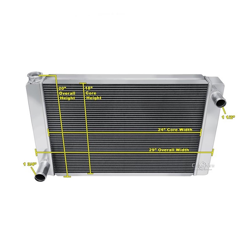 Champion Universal Radiators. These are 3-Tube Cores designed for the Do-It-Yourselfer who can create their own mounting system in their vehicle. These are 'Race Ready', and are made without provisions for a Drain Petcock or a Transmission Cooler. Three Hose Configurations to fit a multitude of engine applications double-pass design. Great for the track or the street in a very budget-friendly pricing package. These include our standard polish and a radiator cap, as well as a vent fitting on the filler neck.IncludesCORE DIM (H x W): 18 x 24OVERALL (H x W): 20 x 29I 3 ROW CORE THICKNESS: 2 1/4 Inch 3 ROW TANK THICKNESS: 3 Inch HOSE LOCATIONS: In - Passenger / Out - DriverHOSE FITTINGS: In -1 1/2 Inch - Out -1 3/4 InchTRANS COOLER: Not availableMOUNTING TYPE: Universal fit saddle mount)3 Row - Three Rows of 5/8 Inch Tubes = Approx. 600-800+ Horsepower Cooling Capacity.