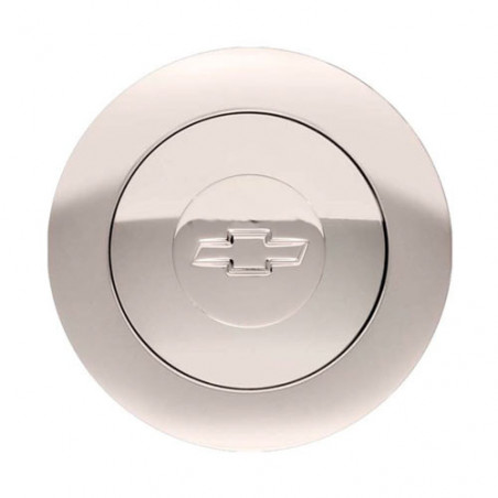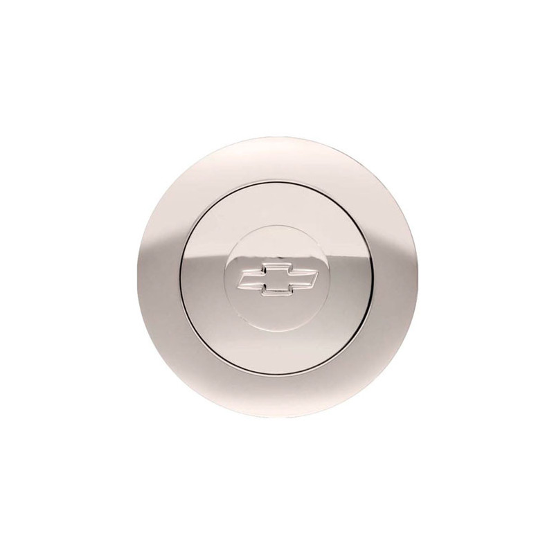 This plain silver GT Performance horn button features an engraved Chevy bowtie. It can also be taken to an engraver to be customized. The large cap design covers the mounting bolts for a sleek look. GT9 Billet Horn Buttons are machined from 6061 Aluminum. It is secured using a unique 'Sure-Lock' O-ring design on a billet base which ensures that your horn button won't pop off in the middle of the night!GT9 style horn buttons are specifically designed for use with GT9 bolt pattern steering wheels. This button is 3.5 inches in diameter and flat. These horn buttons have a 9 bolt mounting pattern and are interchangeable with any 9 bolt steering wheel.