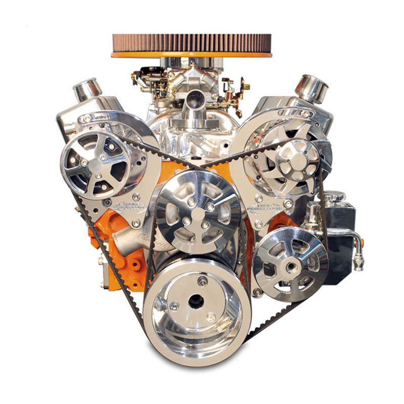New V Drive Systems. Complete kit for Small Block 1970-1988 Monte Carlo with power steering pump with attached billet aluminum reservoir, AC, and alternator. Includes all new components; Tuff Stuff water pump, Maval power steering pump, Sanden style SD7 AC compressor, Powermaster 140amp alternator, Gates v-belts, and all necessary stainless steel fasteners. Polished kits include a polished finish AC compressor and alternator. Colored kits come with natural cast finished components.