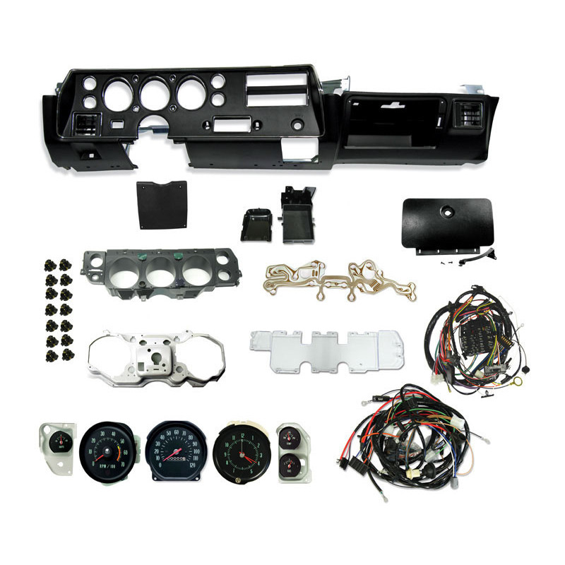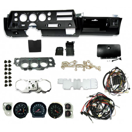 Whether you are replacing an original dash or converting from a sweep style dash to an SS dash, Ground Up has you covered! This deluxe Monte Carlo SS dash conversion kit includes the dash carrier, dash lens, ash tray, glove box door, steering column cover, dash housing, steel backing panel, speedometer, tachometer, clock, temperature and fuel gauge, amp gauge, instrument sockets, printed circuit board, red brake light lens, correct dash harness with fuse box, and correct forward lamp harness or engine harness depending on year. You get it all with this kit!Kit Contains:(1) Super Sport Dash Hardware Kit(1) Super Sport Amp Gauge(1) Super Sport Temperate And Fuel Gauges(1) Super Sport Steering Column Cover(1) Super Sport Dash Lens(1) Super Sport Dash Bezel New Improved With Chrome Trim(1) Dash Gauge Housing(1) Dash Gauge Housing Backing Plate(1) Glove Box Door(1) Super Sport Dash Ash Tray(1) Super Sport Brake Light Lens(1) Super Sport Printed Circuit, With Gauges(1) SS Dash Bulb Socket Kit(1) Super Sport Speedometer(1) Super Sport Tachometer With 5500 Red Line(1) Super Sport Dash Clock(1) Engine Harness, Small Block With Gauges(1) Dash Harness, with Round Gauges & Gauges