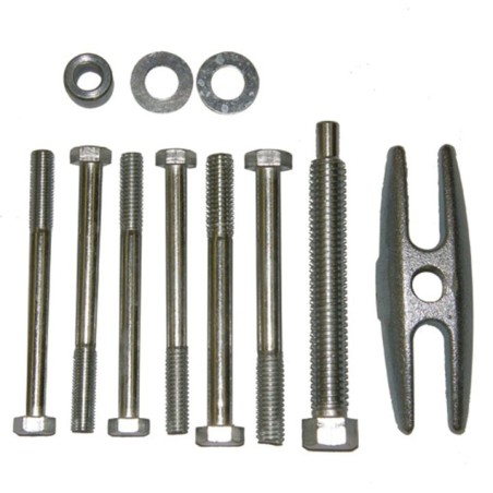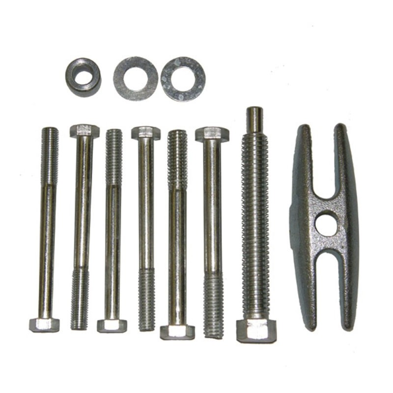 This versatile steering wheel puller kit comes with 11 pieces and will work on most automotive applications. This tool features a durable forged steel crossbar yoke, and high strength hardware, and is used to remove the steering wheel arm from your steering column.Kit Features:Drop forged, heat treated alloy steel yokeHardened and tempered, precision machined bolts1 Yoke1 Center Pressure Bolt2 Pc. 5/16 in - 18 X 3.5 in Bolts2 5/16 in - 24 X 3.5 in Bolts2 3/8 in - 16 X 3.75 in Bolts2 Washers1 Spacer