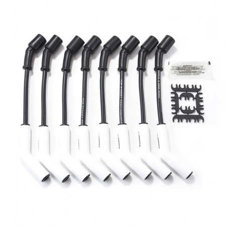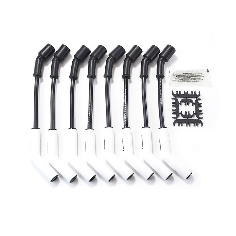 TSP's premium Monte Carlo ignition wires are designed for superior performance and durability. A spiral-wound Kevlar core suppresses RFI (radio-frequency interference) and features 500 ohm per foot resistance for excellent performance. Around the core is a fiberglass braid which provides superior pull strength. The outer jacket is composed of premium high-density silicone rated at 450° F and features a quality gloss finish to resist damage from water and chemicals. This set is not assembled but comes with LS-style terminals for a universal fit.Features and Specifications:Wire Diameter:8.5mmConductor Style:Spiral Wound Kevlar CoreRFI Suppression:YesWire Jacketing:High-density SiliconeSpark Plug Boot Angle:135° CeramicWire End:FemaleWire Color:BlackQuantity:Full Set of 8 Plug Wires