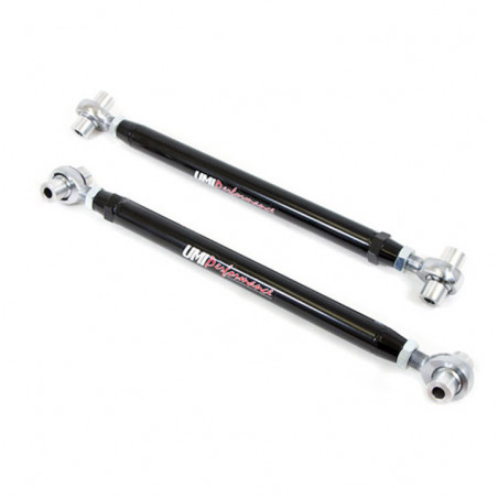 These 1978-1988 Monte Carlo double adjustable control arms are designed for race applications and light duty street use. The spherical rod ends offer a solid foundation and work excellent as a solid bushing control arm while eliminating rear suspension bind. The double adjustment allows easy on car changes for wider tire clearance and to center aftermarket rear ends. These race application control arms are manufactured from DOM steel tubing or optional 4130 chromoly and are TIG welded for the utmost in strength. The premium Teflon lined rod ends attach to the control arms using in-house machined 4130 chromoly tube adaptors. UMI-1978-1988 allows adjustments of 1 inch longer or 1 inch shorter and are supplied pre-set to factory length. These race style control arms are designed for aftermarket sway bars that do not attach to the control arms; control arms are supplied with no sway bar holes.Features:1.250 in. x 0.095 in. 4130 chrome moly steel4140 chrome moly threaded tube adaptorsQA1 3/4 inch hard chrome plated, Teflon/Kevlar self lubricating race rod endChrome moly construction adds increased strength while reducing weightComplete control arm set features TIG welded constructionCNC machined 6061 aluminum step bushingsOn-car adjustability using right and left hand threadsBrilliant durable powder coat