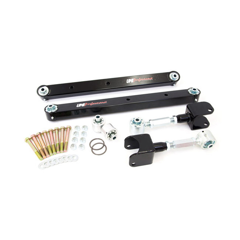 UMI's new pro-touring kit features all of our top of the line Pro-Tour style components in one convenient package. The lower arms are loaded with Roto-Joints on each end and feature TIG welded sway bar sleeves along with the awesome articulation of the double Roto-Joints. The upper arms have Roto-Joints on one end and are fully adjustable to set pinion angle and lateral location. Our new 2999 Roto-Joint axle housing bushing completes the package and ensures bind-free articulation. This 8 Roto-Joint package is the ultimate combination of street comfort and race winning capability. For Pro-Tour cars that see highway use, this kit is like having rod end suspension that just happens to be comfortable. Kit includes boxed lower control arms with Roto-Joints, adjustable upper control arms with Roto-Joints, Roto-Joint rear end housing bushings and grade 8 bolts with nylock nuts. 100% manufactured with pride in Philipsburg, PA USA.