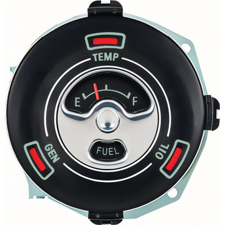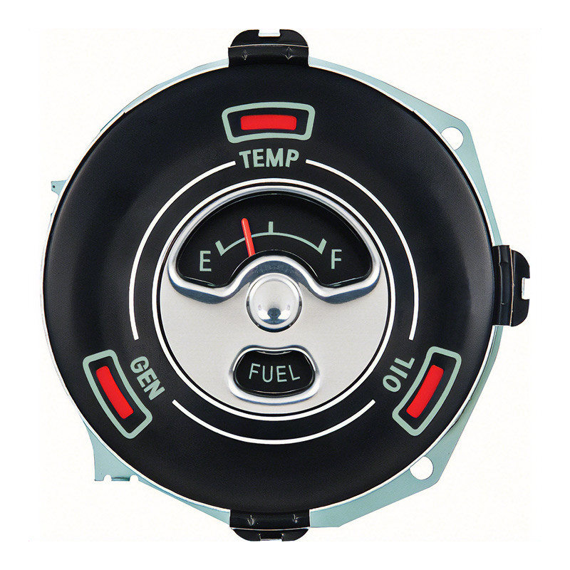1965 Nova reproduction in-dash fuel gauge. Each gauge assembly is manufactured to exact factory specifications and pre-tested for accuracy. Gauge includes the temperature, generator, oil and warning lights.