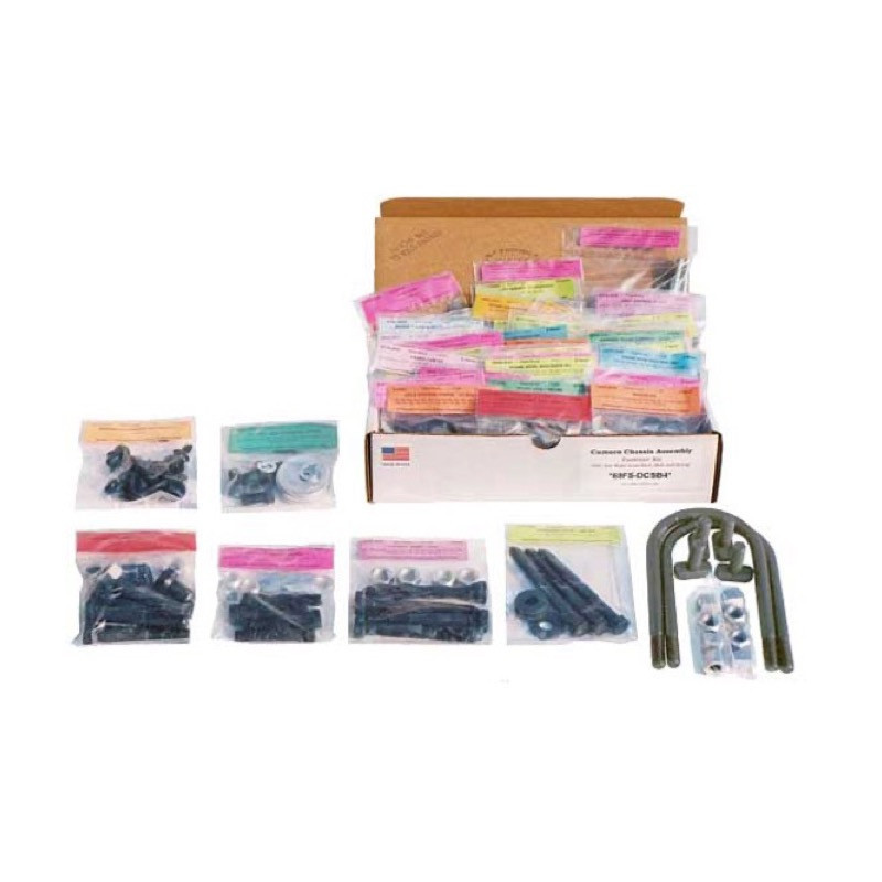 This AMK master chassis hardware kit contains virtually every piece of hardware to assemble the chassis of your Nova with a 307, 327, or 350 small block engine. Typical kit includes fasteners to attach: accelerator lever & support, axle housing, springs, brake booster & hose, brake cables, brake plates, brake hose retainers & brackets, brake valve & pressure switch, calipers & brackets & shields, upper & lower control arms, control arm bushings, differential cover, driveshaft, engine mounts, fuel filler neck cover, fuel hoses, gas tank, grease fittings, idler arm, leaf spring hangers & front eye, master cylinder & push rod, parking brake control, pitman arm, radius rod & bracket & bumper, shackles (nuts), shocks & brackets, stabilizer bar brackets and end links (includes rubber), steering gear & rag joint, steering linkage & ball joints, speedometer cable, trans, suspension bumper, transmission crossmember & insulator, wheel cylinders.