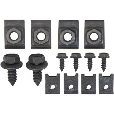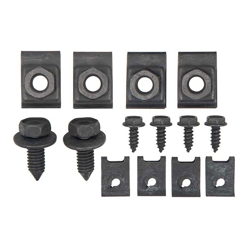 1968-1969 Nova AC condenser mounting bracket hardware. Reproduction of the original AC condenser mounting hardware designed for use on models with air conditioning. This 14 piece set consist of the correct screws and clips to mount the AC condenser to the radiator core support.
