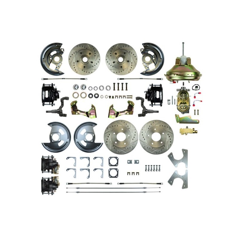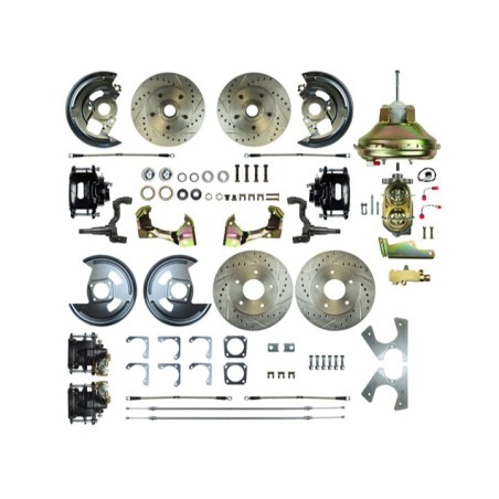 Upgrading your 1968-1974 Nova to four wheel disc brakes is one of the easiest and most cost effective things you can do for more driving enjoyment and increased safety. Classic Novas had great performance and styling from the factory, but left a lot to be desired in the braking department. Upgrade your outdated braking system today with this convenient four wheel disc brake kit from The Right Stuff Detailing and cruise with peace of mind.This kit is complete with a front and rear brake kit.Front Kit Contains:11 Inch Drilled & Slotted RotorsForged SpindlesTimken BearingsBlack Powder Coated Calipers with Pads & HardwareCaliper Mounting BracketsDust CapsCastle Nuts & Cotter PinsGrease SealsSpindle GasketsBacking PlatesOuter Flex HosesPedal Rod Extension (where applicable)Steering Arm Bolts11 Inch Power BoosterMaster CylinderCombination Valve w/ Bracket & HardwareRear Kit Contains:11 Inch Drilled & Slotted RotorsBlack Powder Coated Calipers with Pads & HardwareCaliper Brackets w/ Spacers and HardwareBacking PlatesFlex HosesRear Parking Brake Cables (Correct Length)Do not forget to see the related items for the required brake line kit!