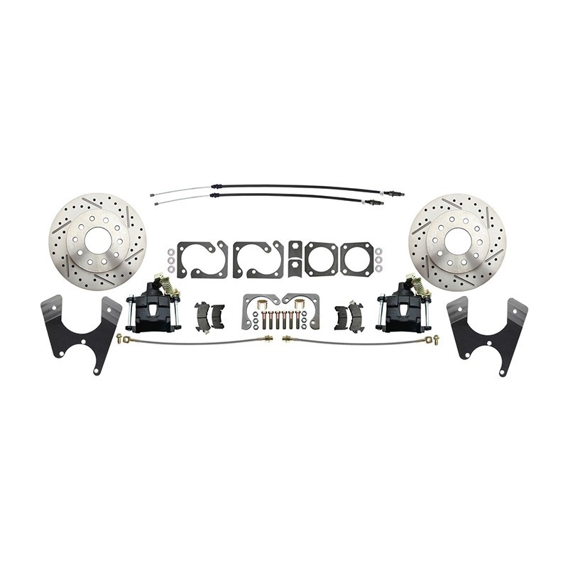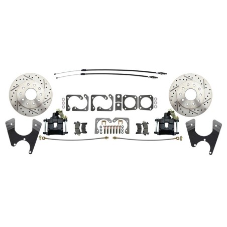 Upgrading your 1968-1974 Nova to rear disc brakes is one of the easiest and most cost-effective things you can do for more driving enjoyment and increased safety. These classics had great performance and styling from the factory but left a lot to be desired in the braking department. Upgrade your outdated braking system today with this convenient Ground Up Exclusive four-wheel disc brake kit and cruise with peace of mind.This rear disc brake conversion kit is complete with a rear brake kit infusing parking brake cables.Kit Contains:11 Inch Drilled And Slotted Multi Pattern RotorsLarge GM Large Bore Single Piston Calipers w/ Self Adjusting E-Brake (1968-1974 Cadillac El Dorado)D54 Pads IncludedCaliper Brackets And SpacersBracket HardwareFlex Hoses And ClipsEmergency Brake CablesKit Features And Specs:11 Inch Vented Dual Bolt Pattern RotorFits 5x4.75 in. w/ 7/16 Studs and 5x4.5 in. w/ 1/2 In. StudsRubber Flex HosesParking Brake Cable Length (1) 36.22 In. (1) 39.76 In.Minimum required wheel diameter 15 InchBlack Powder Coated Cast Iron Calipers