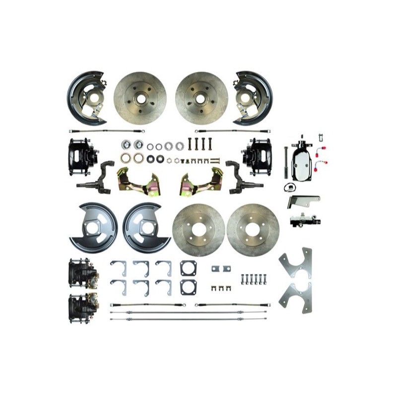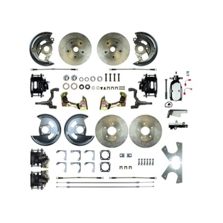 Upgrading your 1968-1974 Nova to four wheel disc brakes is one of the easiest and most cost effective things you can do for more driving enjoyment and increased safety. Classic Novas had great performance and styling from the factory, but left a lot to be desired in the braking department. Upgrade your outdated braking system today with this convenient four wheel disc brake kit from The Right Stuff Detailing and cruise with peace of mind.This kit is complete with a front and rear brake kit.Front Kit Contains:11 Inch RotorsForged SpindlesTimken BearingsCalipers with Pads & HardwareCaliper Mounting BracketsDust CapsCastle Nuts & Cotter PinsGrease SealsSpindle GasketsBacking PlatesOuter Flex HosesPedal Rod Extension (where applicable)Steering Arm BoltsChrome Master CylinderChrome Combination Valve w/ Bracket & HardwareRear Kit Contains:11 Inch RotorsCalipers with Pads & HardwareCaliper Brackets w/ Spacers and HardwareBacking PlatesFlex HosesRear Parking Brake Cables (Correct Length)Do not forget to see the related items for the required brake line kit!