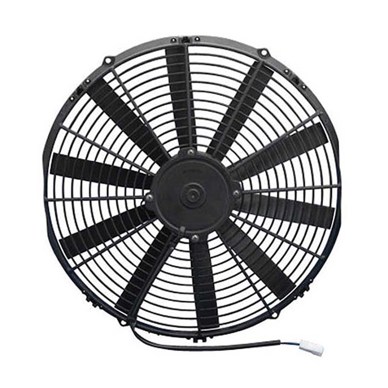 SPAL electric fans and accessories are built to meet the most rigorous cooling requirements needed for today's high performance automotive applications. SPAL fans are durable, reliable, and the choice of many NASCAR teams. SPAL offers a variety of high performance fans perfect for your motorcycle, ATV, automotive, and/or oil cooler applications. Manufactured from sturdy plastic, individually balanced for long service life, and most feature a fully sealed waterproof/dust proof motor for reliable performance in the most extreme conditions. SPAL fans can be mounted to any radiator with universal brackets and shrouds.Key Features:1298 CFMPush Fan DesignStraight Style BladesLow Profile Motor DesignHeight; 16.30inWidth; 15.75inDepth; 2.05inFeatures fully sealed motor to IP68 standards making them waterproof/dust proof12V