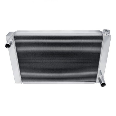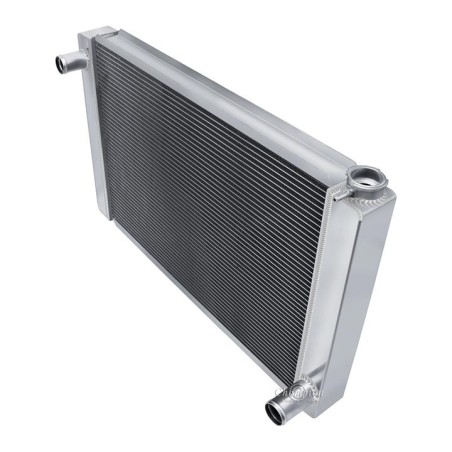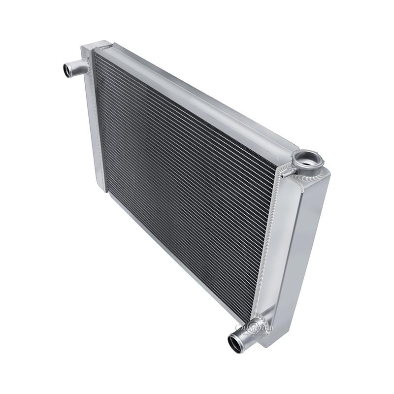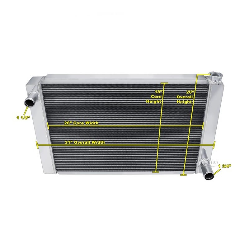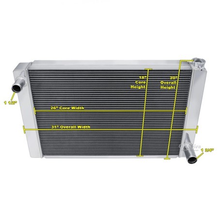 Champion Universal Radiators. These are 3-Tube Cores designed for the Do-It-Yourselfer who can create their own mounting system in their vehicle. These are 'Race Ready', and are made without provisions for a Drain Petcock or a Transmission Cooler. Three Hose Configurations to fit a multitude of engine applications double-pass design. Great for the track or the street in a very budget-friendly pricing package. These include our standard polish and a radiator cap, as well as a vent fitting on the filler neck.IncludesCORE DIM (H x W): 18 x 26OVERALL (H x W): 20 x 31I 3 ROW CORE THICKNESS: 2 1/4 Inch 3 ROW TANK THICKNESS: 3 Inch HOSE LOCATIONS: In - Driver / Out - PassengerHOSE FITTINGS: In -1 1/2 Inch - Out -1 3/4 InchTRANS COOLER: Not availableMOUNTING TYPE: Universal fit saddle mount)3 Row - Three Rows of 5/8 Inch Tubes = Approx. 600-800+ Horsepower Cooling Capacity.