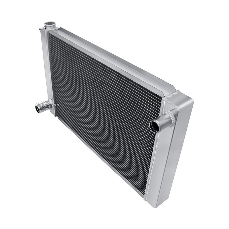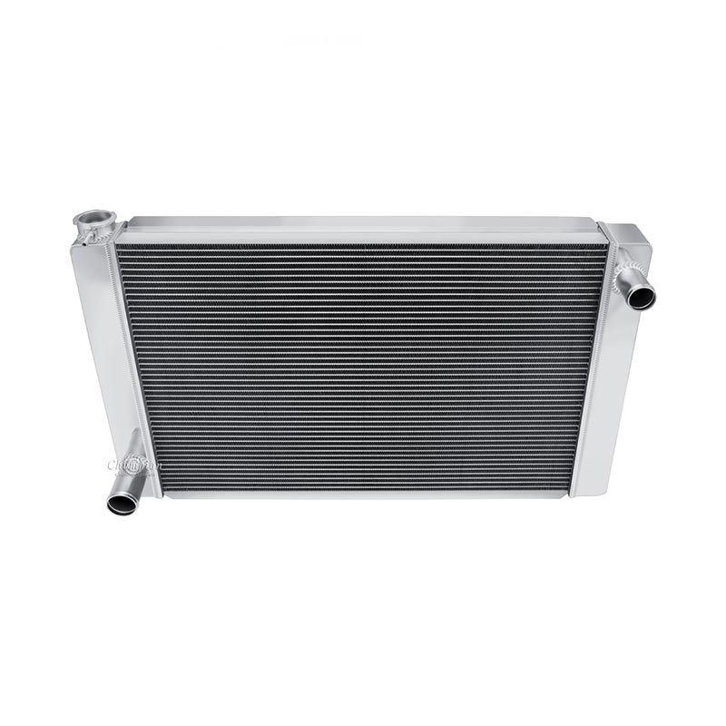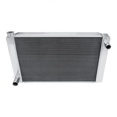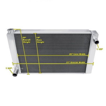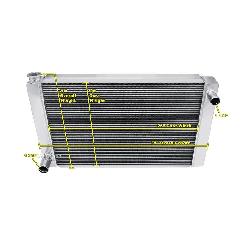 Champion Universal Radiators. These are 3-Tube Cores designed for the Do-It-Yourselfer who can create their own mounting system in their vehicle. These are 'Race Ready', and are made without provisions for a Drain Petcock or a Transmission Cooler. Three Hose Configurations to fit a multitude of engine applications double-pass design. Great for the track or the street in a very budget-friendly pricing package. These include our standard polish and a radiator cap, as well as a vent fitting on the filler neck.IncludesCORE DIM (H x W): 18 x 26OVERALL (H x W): 20 x 31I 3 ROW CORE THICKNESS: 2 1/4 Inch 3 ROW TANK THICKNESS: 3 Inch HOSE LOCATIONS: In - Passenger / Out - DriverHOSE FITTINGS: In -1 1/2 Inch - Out -1 3/4 InchTRANS COOLER: Not availableMOUNTING TYPE: Universal fit saddle mount)3 Row - Three Rows of 5/8 Inch Tubes = Approx. 600-800+ Horsepower Cooling Capacity.