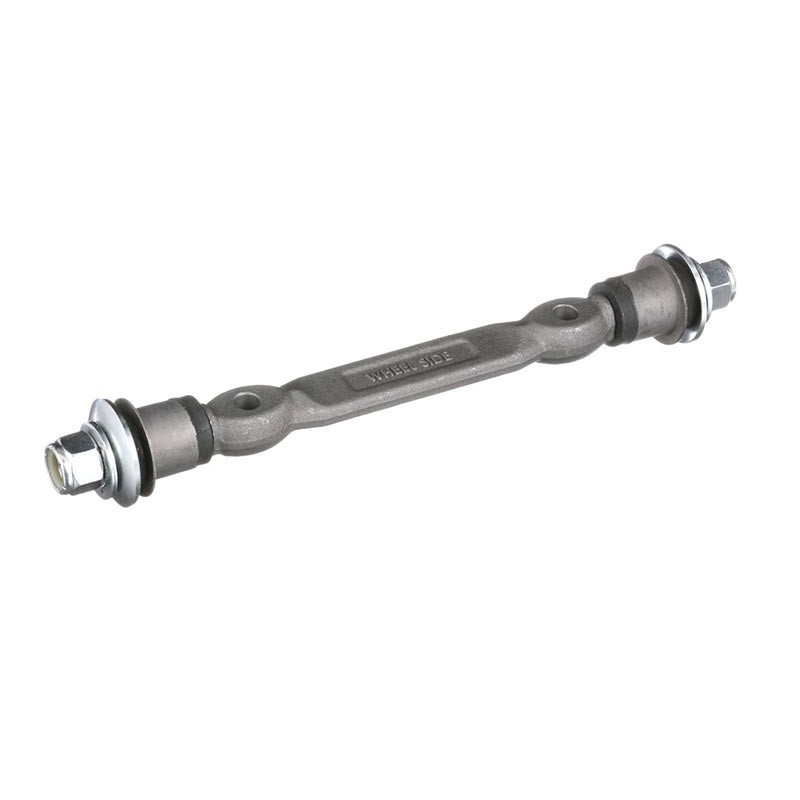 This is a complete Nova control arm shaft kit for rebuilding one upper control arm. This kit includes the the upper shaft a set of bushings, nuts and washers. This style features a retaining nut to retain the bushings. The OE style uses a bolt to retain the bushings.
