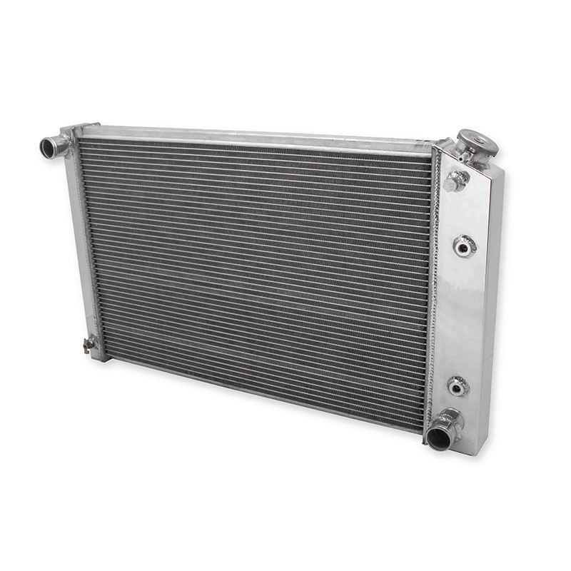 High-Horsepower street cars and trucks can be a challenge to keep cool. A proper cooling system starts with the right radiator. Aluminum Radiators cool more effectively and weigh less than older OEM style brass units. Choose from a variety of popular application specific fitments.Holley is proud to introduce its latest offering - Frostbite Performance Cooling Products.When it comes to keeping your ride cool, Make it Frostbite!Features:100% TIG welded (brazed) seamsAircraft quality aluminum core, fittings, and tanks (up to 30% weight savings)Billet Aluminum Filler Neck and OEM style Brass PetcockMore cooling fins per inch for more efficient coolingCustom Frostbite High Performance 16lb. radiator capPolished top and tanks for custom show appearance2-Row Radiators supporting applications with 300-500 horsepowerManufacturer's 1-year Limited WarrantySpecifications:# of Passes: SingleCooling Row Diameter: 3/4 inchCore Dimension: 17 x 26-1/4 inchCore Thickness: 1.57 inchFlow Style: Cross FlowHose Location Inlet: DriverHose Location Outlet: PassengerInlet Size: 1-1/2 inchMounting Type: Saddle MountOverall Dimension: 18 1/2 x 31 inchRows: 2Transcooler Provision: 1/2-20 Straight Thread G 1/4
