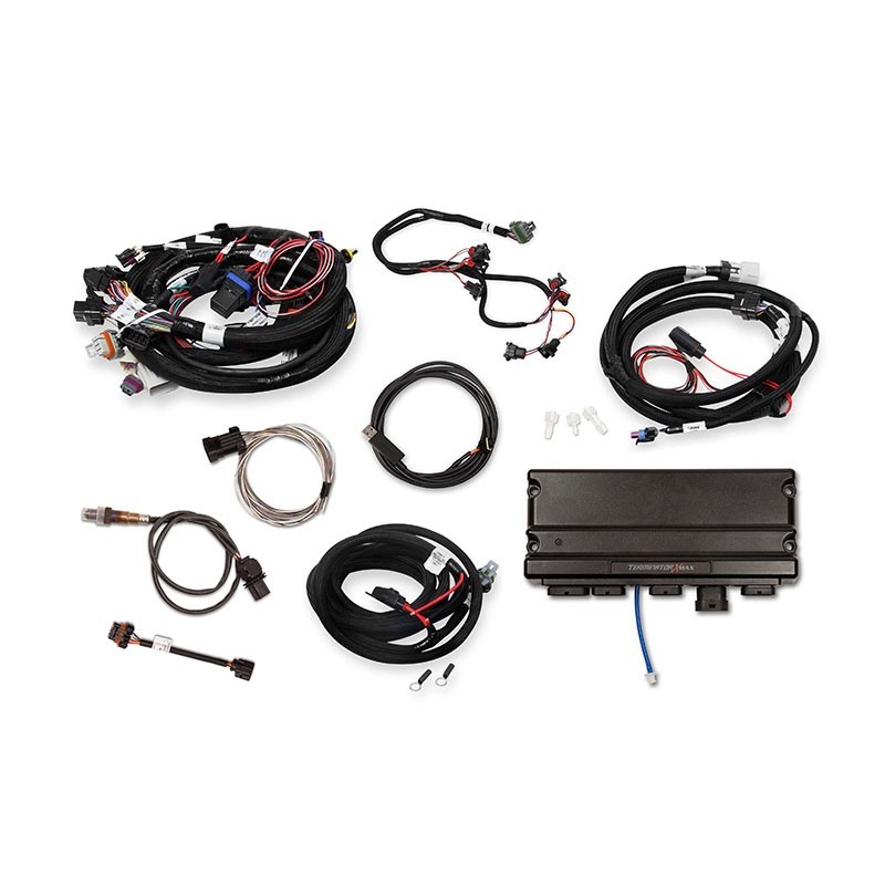Take control of your LS engine with Holley EFI Terminator X Max! Don't settle for a junkyard ECU with a cumbersome tuning interface when you can have complete control of your engine, self-learning fuel strategies and the proven, race-winning technology of Holley EFI at a budget-friendly price! Terminator X Max features real-time fuel learn, high impedance injector drivers, an integrated 1bar MAP sensor, and 4 programmable inputs and outputs. The inputs and outputs are ideal for electric fans, boost control solenoids, progressive nitrous control, and much more. Part number 550-916 also has 4L60E or 4L80E Transmission control. Terminator X Max comes fully loaded with base maps for common LS engine combinations to get you out of the garage and on the road/track fast. These Terminator X kits include a USB/CAN tuning cable instead of the 3.5 IN Handheld LCD, these kits require the use of the free Terminator X Software for initial setup. The Terminator X Software includes multiple base calibrations to choose from for either naturally aspirated or boosted engines. Also included is Holley EFI's industry-leading, easy to use software suite that allows full laptop access for advanced users. Whether you are building a budget beater or a boosted race car, Terminator X MAX has the features and technology you need at a price that won't break the bank!Features:For GM LS1/LS6 engines with 24x crank reluctor with EV1 injectors and 4L60E/4L80E transmissionsReal-Time fuel map learn, takes the guess work out of tuning your base fuel table.High Impedance Injector Drivers will safely power most Stock LS injectors, and Holley EFI Injectors. Injector support chart provided in the instructions (Will not control Low Impedance Injectors)All of the new Terminator X Max systems utilize the Bosch LSU 4.9 wideband to relay AFR information to the ECU for accurate reading and precise tuning control.On-Board 1bar MAP sensor, is perfect for N/A or Nitrous engine combos. If your combination requires a 2+Bar, we recommend GM 12592525, and our adapter part number 558-416.MAP Sensor vacuum hose adapters (1/8th – ¼ and 3/16ths)4 Inputs – 12v, Ground, 5v, and Frequency, for things such as additional pressure sensors, or activation triggers for nitrous activation, or a trans brake4 Outputs – Ground, PWM - , for accessories such as; fans, boost control, nitrous control, IAC Kit, and MoreBoost Control – Boost vs Time, Boost vs Gear, Boost vs RPM, Boost vs Speed, Boost SafetiesNitrous Control – Single Channel of Wet or Dry, Progressive or Non-Progressive, Rich/Lean Safeties, and target Closed Loop AFRAdvanced Tables – 4x 1D Tables, 1x 1D per Gear Table, 4x 2D Tables, 1x 2D per Gear Table, can be used for any custom tables you can dream up, such as Flex Fuel Sensor Offset Table, or a custom fuel or oil pressure safety!On-Board Diagnostic LEDS for: ECU Power – Engine Run – Wideband Status – TPS Calibration – Crank Signal –Cam Signal. Allow you to identify any Critical engine issues at a glanceIncludes CAN/USB tuning cable allowing you to configure your ECU and Tuning the engine in real time.The compact ECU size allows you to mount it virtually anywhere. Remember, diagnostic LEDS must face up!Plug and play compatible with more Holley EFI accessories such as; analog style gauges, shift lights, various modules, and coming soon, 12.3" digital dash support!Free EFI Tuning Software for complete control of your Terminator X power plantIncludes: 24x LS Engine Main Harness - EV1 Injector Harness - 4L60E/4L80E Transmission Control Harness - Terminator X MAX ECU - ECU Main Power Harness - Bosch LSU 4.9 Wideband Oxygen Sensor - Input/Output Harness - and assorted vacuum adapters.