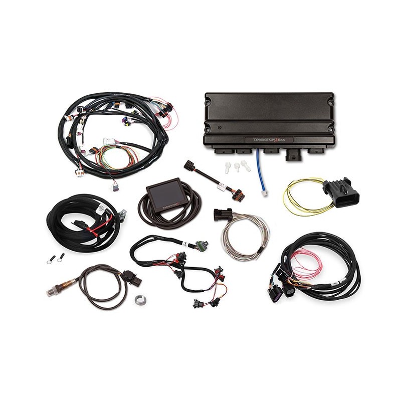 Take control of your engine with Holley EFI Terminator X! Don't settle for a factory ECU with a cumbersome tuning interface when you can have complete control of your engine, self-learning fuel strategies and the proven, race-winning technology of Holley EFI at a budget-friendly price! Terminator X features real-time fuel learn, high impedance injector drivers, an integrated 1bar MAP sensor, and 4 programmable inputs and outputs. The inputs and outputs are ideal for electric fans, boost control solenoids, progressive nitrous control, and much more. Terminator X comes fully loaded with base maps for common V8 engine combinations to get you out of the garage and on the road/track fast. The 3.5 IN touch screen LCD handheld contains an easy to use calibration wizard as well as tuning and gauge display functions. Also included is Holley EFI's industry-leading, easy to use software suite that allows full laptop access for advanced users. Whether you are building a budget beater or a boosted race car, Terminator X has the features and technology you need at a price that won't break the bank!Features:Plug and play Domestic V8 engine control, such as conventional push rod Chevrolet and Chrysler engines.Includes EV1 Injector HarnessGM DBW Throttle Body Control Harness (Terminator X Max Only)High Impedance Injector Drivers will safely power most Stock injectors, and Holley EFI Injectors. Injector support chart provided in the instructions (Will not control Low Impedance Injectors)Bosch LSU 4.9 wideband to relay AFR information to the ECU for accurate reading and precise tuning control.Built in 1bar MAP Sensor, vacuum hose adapters included (1/8th - 1/4 and 3/16ths) - or for Boosted applications, you can disable the internal MAP sensor, and utilize an external MAP Sensor, the harness comes with the connector terminated, making the installMAP Sensor vacuum hose adapters (1/8th - 1/4 and 3/16ths)Plug and plug ignition capability with Dual Sync and HyperSpark Distributors, adapter 558-323 required for HyperSpark Distributors.4 Inputs – 12v, Ground, 5v, and Frequency, for things such as additional pressure sensors, or activation triggers for nitrous activation, or a trans brakeBoost Control – Boost vs Time, Boost vs Gear, Boost vs RPM, Boost vs Speed, Boost SafetiesNitrous Control – Single Channel of Wet or Dry, Progressive or Non-Progressive, Rich/Lean Safeties, and target Closed Loop AFRAdvanced Tables – 4x 1D Tables, 1x 1D per Gear Table, 4x 2D Tables, 1x 2D per Gear Table, can be used for any custom tables you can dream up, such as Flex Fuel Sensor Offset Table, or a custom fuel or oil pressure safety!On-Board Diagnostic LEDS for: ECU Power – Engine Run – Wideband Status – TPS Calibration – Crank Signal –Cam Signal. Allow you to identify any Critical engine issues at a glanceThe included 3.5 IN Touchscreen Handheld contains a calibration wizard, that allows you to quickly build a base tune for any LS engine. Additionally the handheld provides internal data-logging and a fully customizable gauge display.The compact ECU size allows you to mount it virtually anywhere. Remember, diagnostic LEDS must face up!Plug and play compatible with more Holley EFI accessories such as; analog style gauges, shift lights, various modules, and coming soon, 12.3" digital dash support!Free EFI Tuning Software for complete control of your Terminator X power plant