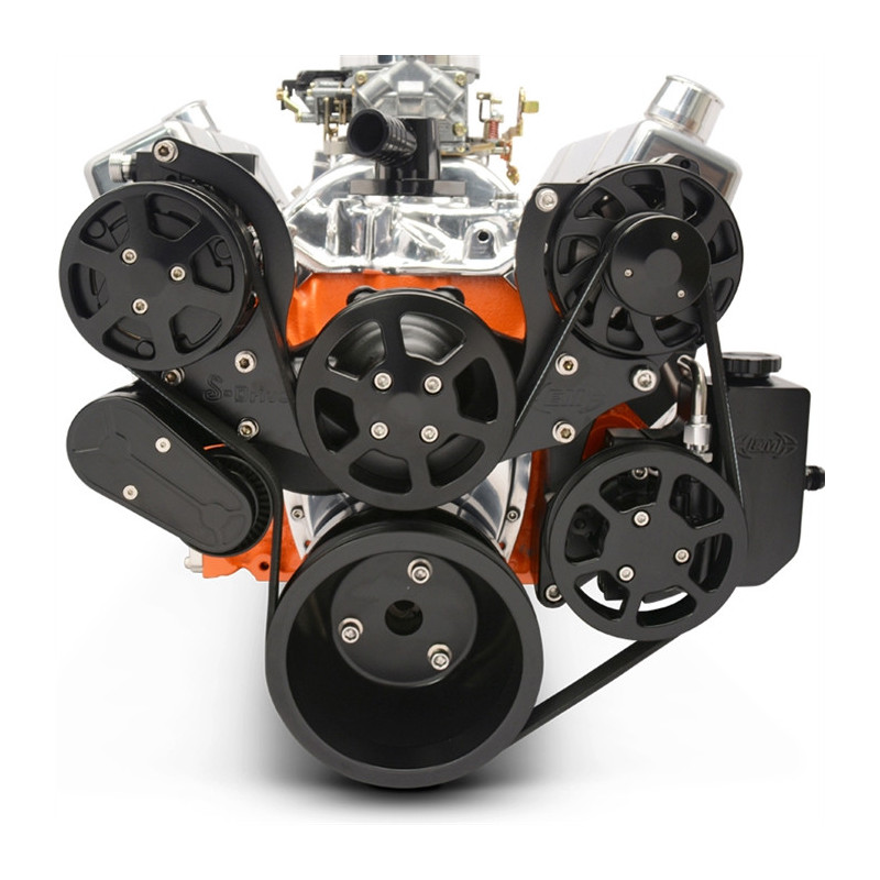 Eddie Motorsports' S-Drive 6 rib serpentine pulley kits for Nova include everything to accessorize your Small Block Chevy engine. Kits come complete with all of the necessary precision CNC machined billet aluminum brackets & pulleys, which are made in the USA, as well as high quality, name brand components; Tuff Stuff aluminum water pump, Sanden compact AC compressor, Maval power steering pump with attached aluminum reservoir, Powermaster 170 amp alternator. Matte Black Fusioncoat finish.