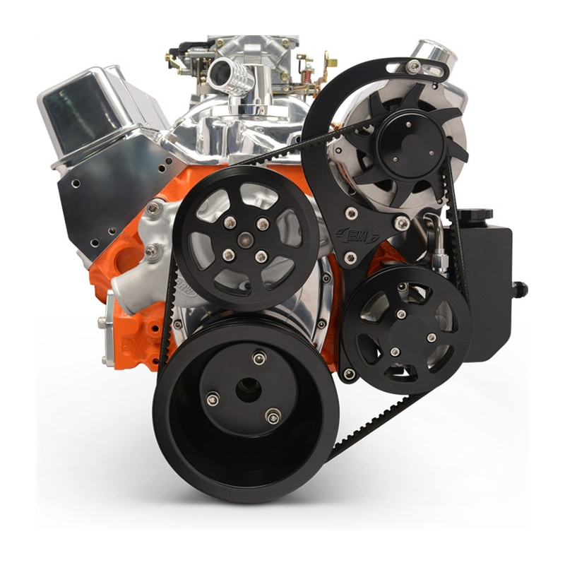 Eddie Motorsports' V Drive v-belt pulley kits for Nova include everything to accessorize your Big Block Chevy engine. Kits come complete with all of the necessary precision CNC machined billet aluminum brackets & pulleys, which are made in the USA, as well as high quality, name brand components; Tuff Stuff aluminum water pump, Maval power steering pump with attached aluminum reservoir, Powermaster 170 amp alternator. This kit does NOT include an AC compressor. Matte Black Fusioncoat finish.