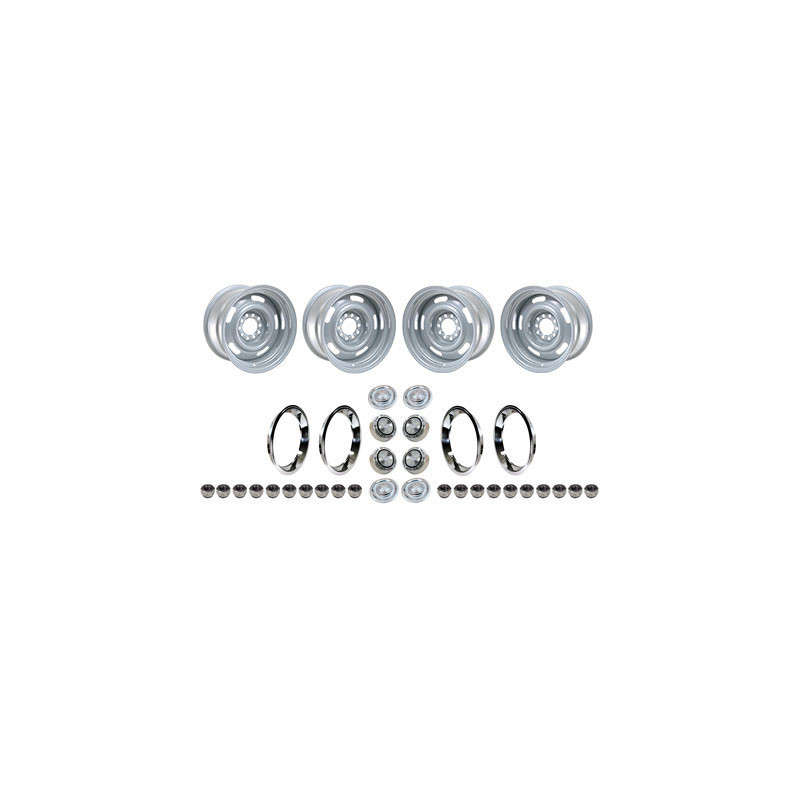 Why sift the junkyards for used Nova wheels or try to repair originals when you can add a complete set of wheels, caps, and trim rings to your Nova for a special low price? This Novaparts kit includes (4) powder coated argent silver rims, (4) Chevrolet Motor Division Flat Caps, (4) center cap retainers, (4) trim rings, and (20) lug nuts. This means you get everything that you need to get your muscle car rolling in style.Kit Contains:(1) Rally Wheel Trim Rings Kit 14 X 6(20) Acorn Style Lug Nut 7/16 Inch(1) Center Caps(4) Rally Wheel 14 X 6 with Disc Brakes