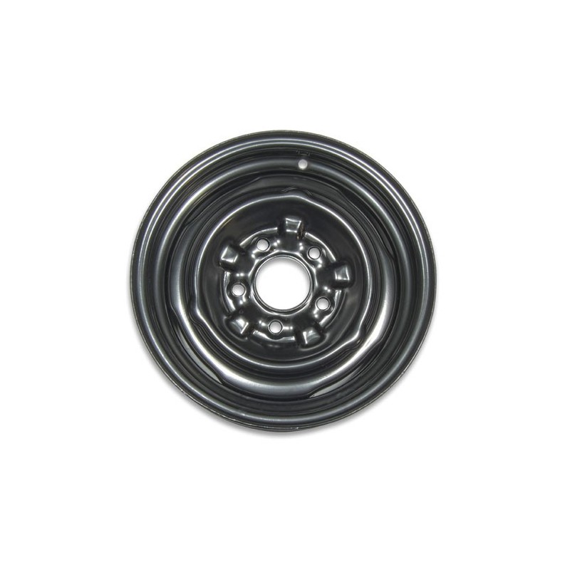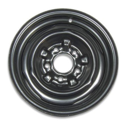 This is a brand new factory style steel Chevrolet wheel which was usually standard equipment on six cylinder cars, Special High Performance Cars, and COPO cars. These steel wheels were usually discarded over the years in favor of rally wheels or super sport wheels and are tough to find. This rim is perfect for your bone stock restoration, COPO recreation, or sleeper.