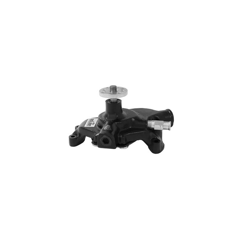 Short style water pump for Small Block Chevy, Black finish, Cast iron housing, premium quality center shaft, bearings and seal for long term dependability, 5/8 inch hub pilot, 5.659 inch hub height. Super Cool impeller provides 30% more cooling flow over stock water pumps.