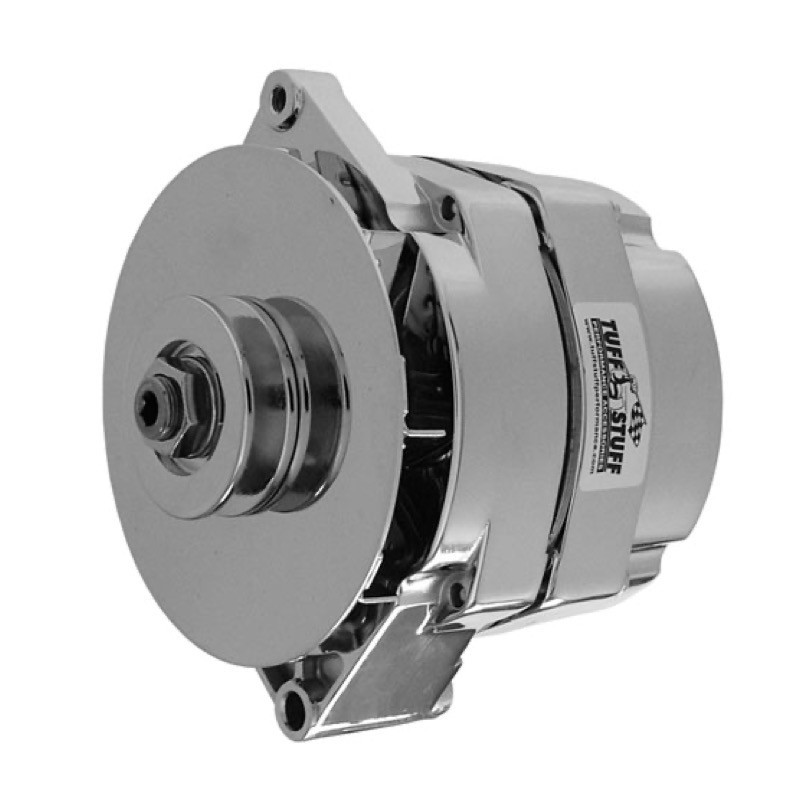 GM 10SI alternator, 80 Amp, 1-wire easy hook up, chrome finish, V groove pulley, low idle internal regulator, and spike resistant diodes.