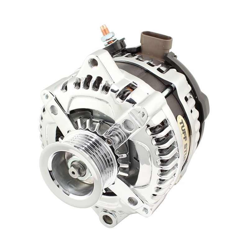 These MAX AMP alternators provide up to 165 Amps at idle - 225 Amps at full charge! The 7866 Series alternators are the same form factor as the Delco CS130 1962-1979 to 1962-1979 GM cars and light trucks with a left-offset 5.25 inch hole spacing.. The OEM hookup alternators include wiring adapters for the 10SI and CS130 applications. Available in chrome plated, black powder coat or Factory Cast PLUS+ finishes. For safe operation, these alternators require a #4- or #2-gauge charge wire, depending on wire length. Tuff Stuff alternators are quality built in USA from 100% new components, are tested to far exceed OEM specifications and carry a one-year limited warranty.Features:225 MAX AMP; 165 Idle Amp1-GrooveTwo Wire Harnesses For 10SI And CS130Chrome PlatedInternal Voltage RegulatorSame Form Factor As Delco CS130 7861Requires A No.4 Or No.2 Gauge Charge Wire; Depending On Wire Length