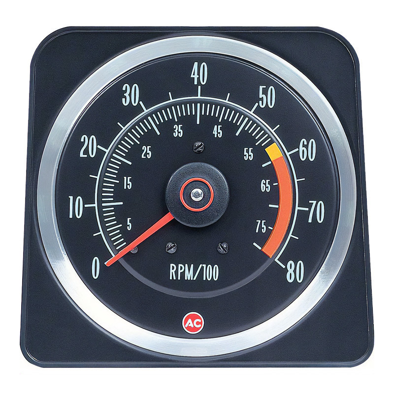 1969 GM reproduction of the original 6 x 8 rpm tachometer originally installed in all GMs originally equipped with 396/375hp models, or 302 Z/28 models built from 1/1/69 until 10/15/69. Each tachometer is manufactured to correct factory specifications and duplicates the original in functionality, fitment and appearance. The faceplate features correctly placed silkscreened lettering and numbers. All tachometers bench tested and pre-calibrated to ensure proper readings when installed.