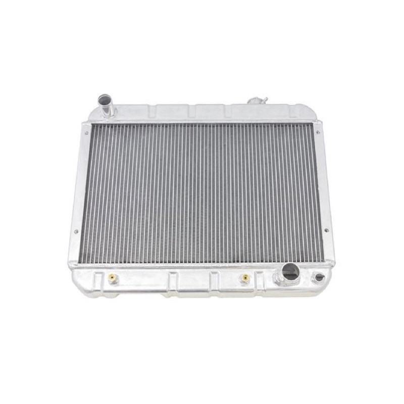 The 2-core aluminum radiator features dual 1-1/8 inch high-flow aluminum tubes, offering double the capacity of a stock 2-row or 33% increased cooling compared to a 1/2 inch 3-row. Lightweight aluminum construction provides excellent heat dissipation, making it ideal for mild to high-performance applications. Inlet measures 1-1/2 inch and outlet 1-3/4 inch.