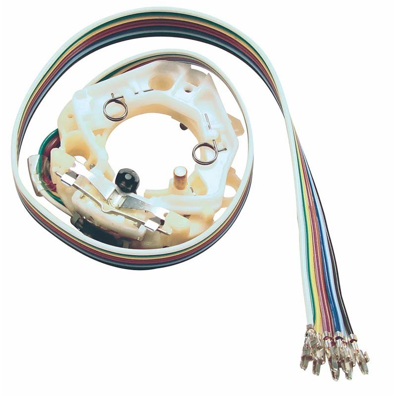This is a complete turn signal switch assembly all, without column shift automatic transmission, with and without tilt, without cornering lamps, with correct plug in harness for your 1967-1968 GM DELCO-GUIDE type switch for cars without column shift auto. Emergency flasher actuator hole in outer collar is round