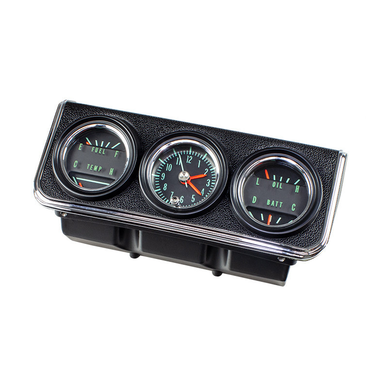 1967 GM reproduction console gauge package. This unique console gauge package is completely pre-assembled and ready to install. Each complete assembly features a die-cast console gauge bezel, the bottom gauge housing mounts to console, Fuel gauge, Temp Gauge, Oil Gauge, Battery Gauge and Center Clock. If the vehicle originally had console gauges, it will install using the original wiring. If adding console gauges to a vehicle not originally equipped with factory console gauges, you will need the console gauge wiring harness sold separately.