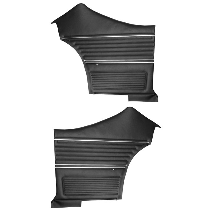 This is a set of high quality PUI 1969 GM preassembled door panels which are constructed of the finest materials available. These pre-assembled panels feature correct vertical chrome Mylar strips on the Rears. Also included are installed metal top rails, window felts, and chrome like trim pieces. Door lock ferrules are included.