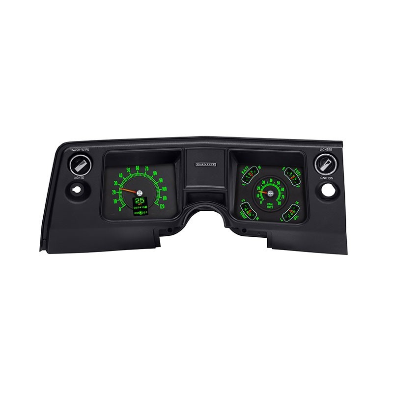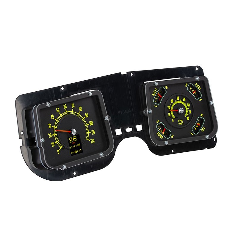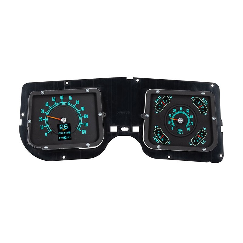 When GM redesigned the A body platform, the larger Coke bottle design meant a new dashboard; the 1968 GM, GM and GM received two large square gauge openings. The RTX-68C-CVL is a bolt-in system that uses your stock bezel while adding a host of 21-Centruy features. A full-color TFT message center under the speedometer with an 8,000RPM tachometer in the center of a quad-gauge keep the driver fully informed while the OEM-look will not ruin the vintage vibe.The RTX series is the latest from Dakota Digital, focused on retaining that stock look without sacrificing the late-model features you love. Every effort has been put forth to incorporate OEM design elements regarding the layout, face styling and indicators. A casual glance may dismiss these as original equipment, but once you hit the switch and the LED backlighting comes on in your favorite color scheme, all doubts will be removed.Starting from scratch, CNC machined housings are filled with electronics designed and built in-house, helping Dakota Digital once again raise the bar for aftermarket instrumentation. The high-definition TFT message centers can be fully configured to display just about any piece of information needed, or just leave the vintage-looking tumbler odometer on the screen for a totally stock appearance. As you've come to expect from Dakota Digital, the RTX series utilizes a central control box to make installation and setup as easy as possible.Features:Over 30 User-Selectable Display Colors Available: Select backlighting colors for the needles, digital display and printed gauge readings independently, or choose from one of 12 preset lighting themes.Full Color TFT Message Centers: Can be configured to suit each driver, fully adjustable for color and information readout.Bluetooth App: All calibration settings and personal preferences can be selected through the Apple and Android app or through the provided programming switch.RGB Backlighting: LED illumination filters through the instrument rather than shining onto the face, making the lighting crisp for excellent visibility. Brightness is fully adjustable for day and night settings.Fully-Lit Needles: Translucent needles are easy to see at a glance, day or night.CNC Machined Structure: HDPE and aluminum are combined for a solid, sealed display with an exact fit.Auxiliary Input: BIM I/O port allows considerable expansion; more readings and data displayed.Simple Outputs: Proprietary cables connect directly to instrument and clock displays.Integrated Terminal Strips: Easily connect existing wiring and supplied sensor harnesses for a clean finished product.Warning Outputs: Two, RPM and user definable, for connection to an external light or relay.