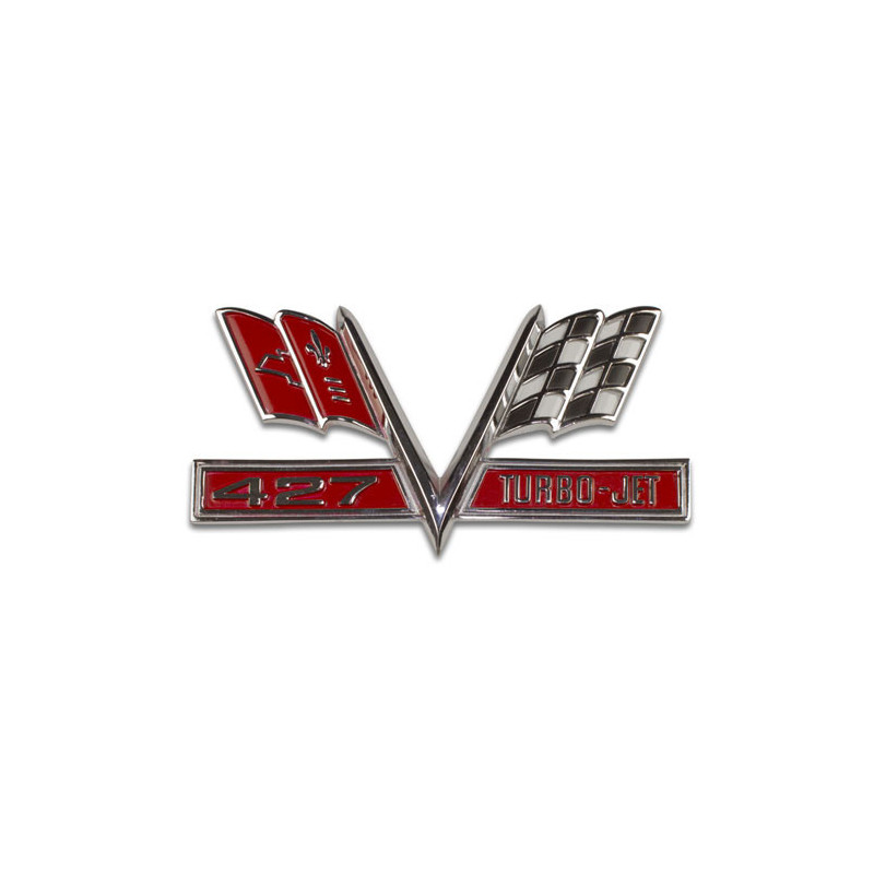 Originally found on 1965-1967 full size Chevys, this 427 Turbo Jet cross flag emblem is a popular upgrade for 427 powered GMs. This emblem is identical to the stock 396 Turbo Jet emblem that came on the GM but features a 427 logo inside of a red background.