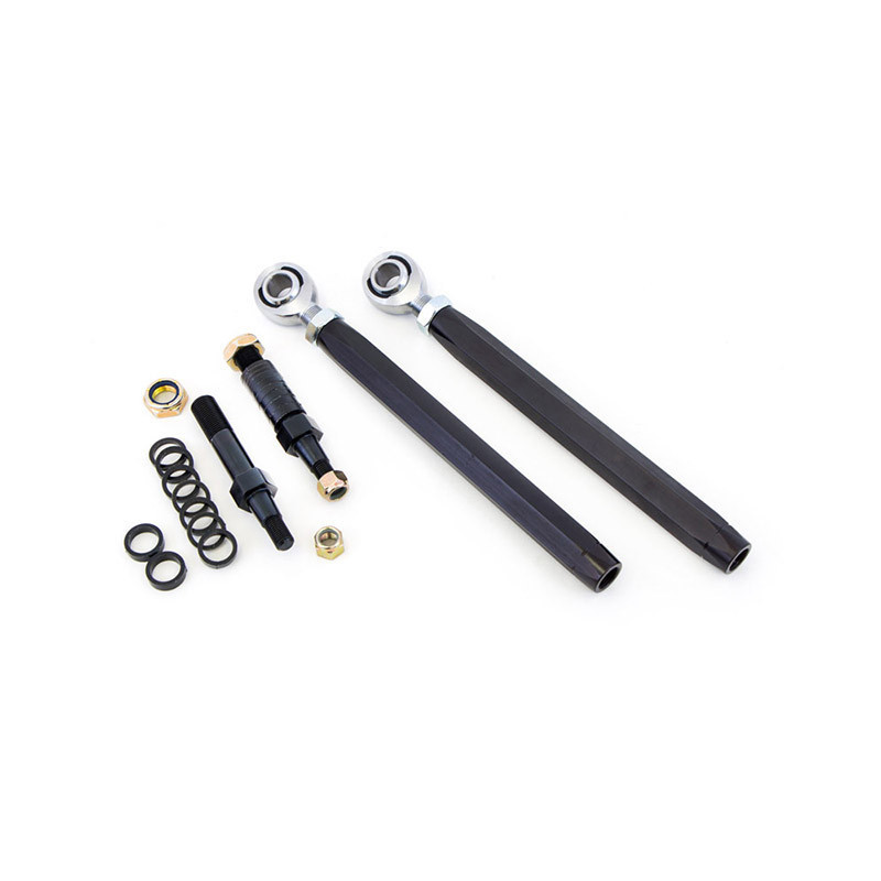 UMI's GM bump steer kit is designed to reduce or eliminate toe change during suspension travel (also known as bump steer). Reduction of bump steer improves handling and straight line stability and enhances overall precision of the steering system. These direct bolt-in kits allow the builder to relocate the outer tie rod end lower than stock (or higher if necessary). The stud taper is designed for exact factory fit for each application and is constructed of 4140 CrMo for strength and durability, no spindle drilling required. The adjuster is 6061-T6 aluminum hex for lightweight strength and features a hard anodized protective finish. Kit includes shims of 0.125 inch, 0.1875 inch, and 0.250 inch. These race tested bump steer kits are 100% designed and manufactured with pride in Philipsburg, PA - USA.Features:4140 CrMo stud constructionRace quality rod end, jam nuts and locking hardwareLaser cut spacers: 0.125 in. / 0.1875 in. / 0.250 in.6061-T6 aluminum toe adjuster, hard anodized, 5/8 RH and 5/8 LH threads, 9.200 in. sleeve lengthWorks with factory inner tie rods and factory spindleSimply bolt-on. No spindle drilling requiredInstructions with technical links includedManufactured with pride in Philipsburg, PA - USABattle tested on the UMI GM test car