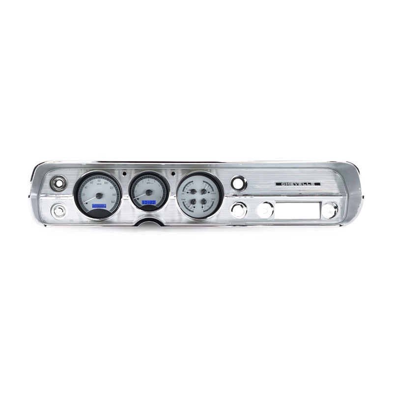 The new VHX Systems fit directly into the stock instrument bezel of a 1964-1965 and 1964-1965 Chevy GM and GM without modification, adding a wealth of features to this iconic vehicle. Fully lit needles, backlit faces, and highly visible LCD message centers are a few of the things that you can see which set the VHX Series apart from yesterday's traditional approach to instrumentation. A few of the features which you don't normally see are the micro-controlled precision stepper motors, solid state sensors for unparalleled accuracy, and user-customizable display feedback, all supported by an unrivaled limited lifetime warranty which has become the standard for Dakota Digital instrumentation systems . Completely engineered and manufactured in the USA, the VHX Series has completely revolutionized the instrumentation industry!Features:Analog Gauges:Speedometer : 0-160 MPHTachometer: 0-8000 RPMOil Pressure: 0-80 psiWater Temperature: 100-260 FahrenheitFuel Level: E, 1/4, 1/2, 3/4, FVoltmeter: 9-17 VDCLighting: Back lit technology is popular with performance instrumentation due to precise lighting allowing you to see what is truly important when you really need it at a quick glance. Each number, tick mark, annunciator, needle, indicator and digital message center is lit by a series of LEDs behind the gauge face.Digital Message Centers:Standard Displays: Odometer (one time user settable, million mile), Dual (A/B) Trip Meter (0-9,999.9), Clock (12 hour)Performance Meters: 0-60 MPH Timer, 1/4 Mile Time, 1/4 Mile End Speed (trap speed), High Speed Recall, High RPM RecallGauges: Speedometer (0-255 MPH/kmh), Tachometer (0-9,900 RPM), Oil Pressure (0-100 psi displayed in 1 psi increments), Water Temperature (100-300 degrees Fahrenheit displayed in 1 degree increments), Voltmeter (9-17 VDC), Fuel Level (0-99% full)Lighting: Auto-contrasting LCD display for optimal view in the brightest of sunlight, LED backlit at night to match/complete the look at nightBuilt-In Indicators:Turn SIgnalsHigh BeamCheck EngineParking BrakeCruise ControlGear Position (optional GSS-1964-1965 sensor required)4x4 (when vehicle is equipped)Wait to Start (when vehicle is equipped)Included Sensors:Water Temperature: 1/8 in. NPT, ground isolated sensor with a 10ft harnessOil Pressure: 1/8 in. NPT solid state sensor with a 10ft harnessCable Driven Speed Sensor/Generator: Replaces GM style speedometer cables with a 10ft harnessBushings: Each kit comes with 1/8 inch to 1/4 inch, 3/8 inch and 1/2 inch NPT bushings along with bushings for 12mm and 16mm x 1.5 threadsCalibration:Pushbutton: Dakota Digital instruments are programmed and operated by the push of a button. SImply mount the included pushbuttons supplied with your gauges in a convenient and easily accessible location. These buttons are used to calibrate your speedometer, set the cylinder count and fuel level gauge. Once properly configured, these same buttons are used to access the wealth of information located in the Digital Message Centers
