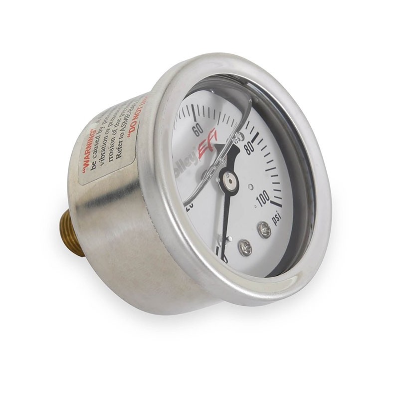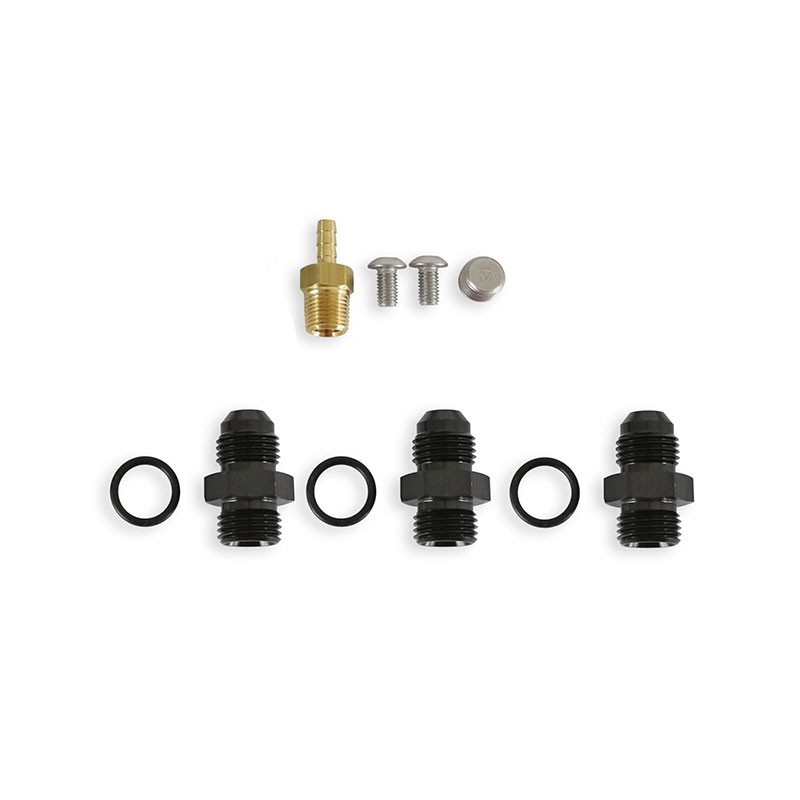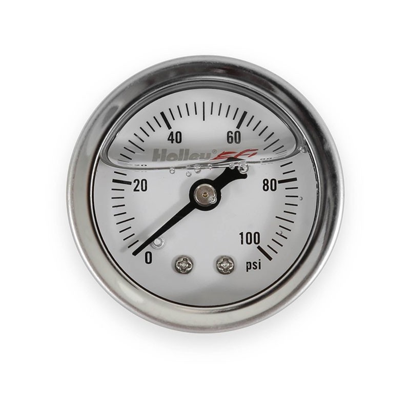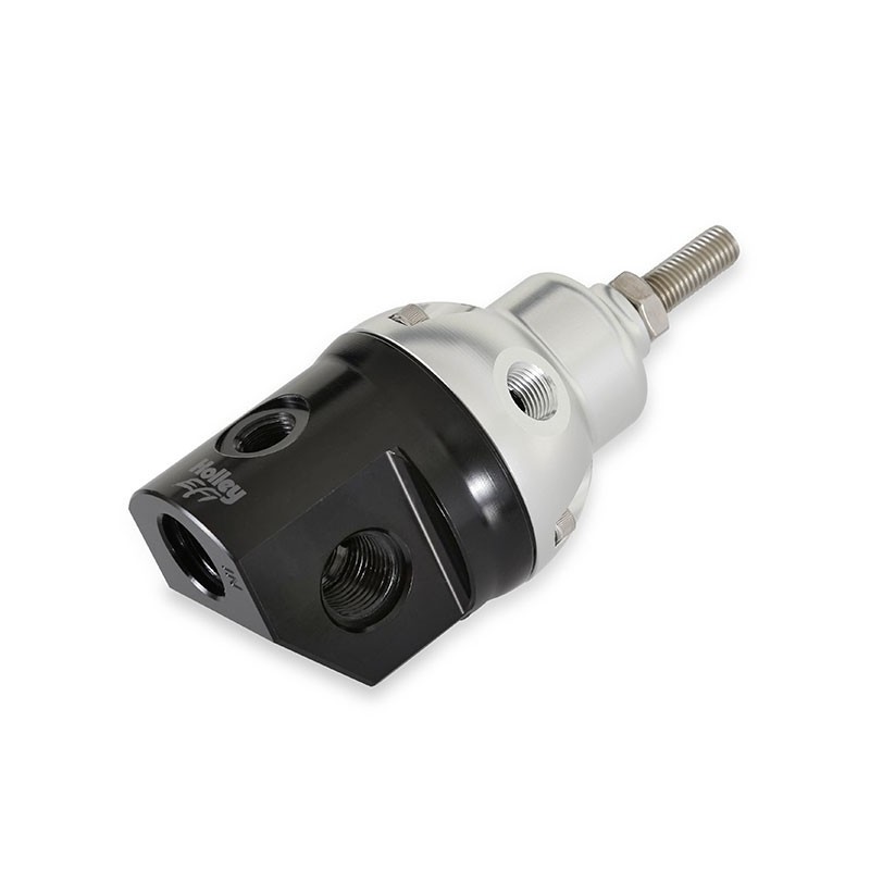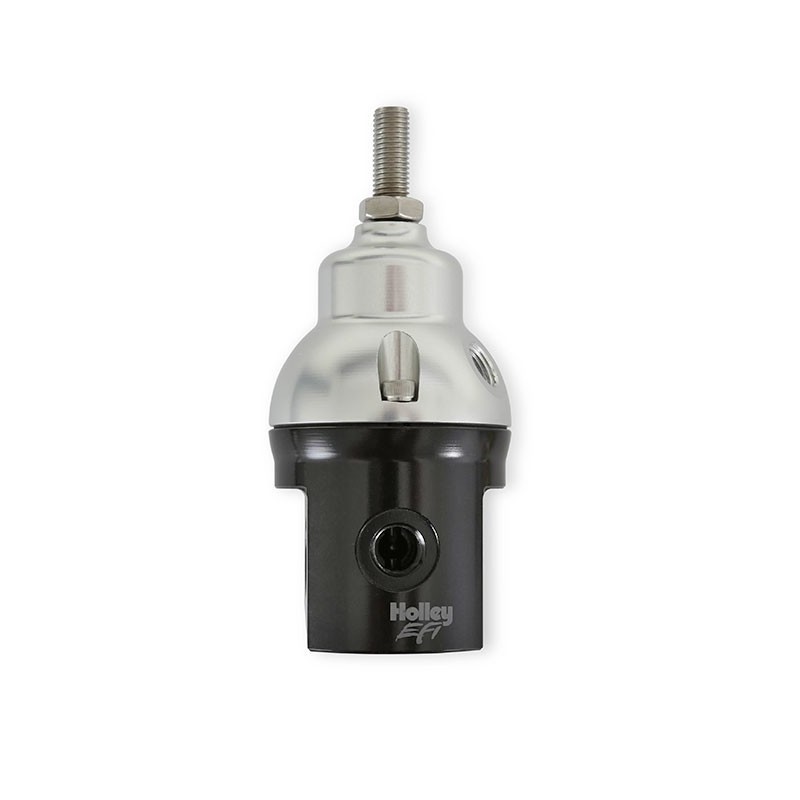 Holley EFI universal bypass fuel pressure regulators are for use with fuel systems in street or track applications. They feature adjustable base pressure from 15-90 psi, a gauge port, and a boost reference port as well. The regulators are ideal for vehicles/systems where superior flow and pressure control are desired. The regulators are precision machined from 6061-T6 billet aluminum for strength and durability. They feature a black bright dip anodized body and a clear bright dip anodized top for corrosion resistance and good looks. The Holley 12-894 has -6AN port sizes and the 12-895 has -8AN port sizes.Features:Adjustable from 15-90 psi for precise fuel pressure adjustmentsRegulator constructed of billet aluminum with a black anodized base and clear anodized top for good looks and corrosion resistance.Kit includes Holley Fuel Pressure Gauge (PN 26-507)Regulator Features an 1/8in NPT Gauge Port and 1/8in NPT Boost Reference Port (Barbed Fitting Included)Mounting bracket and fittings included