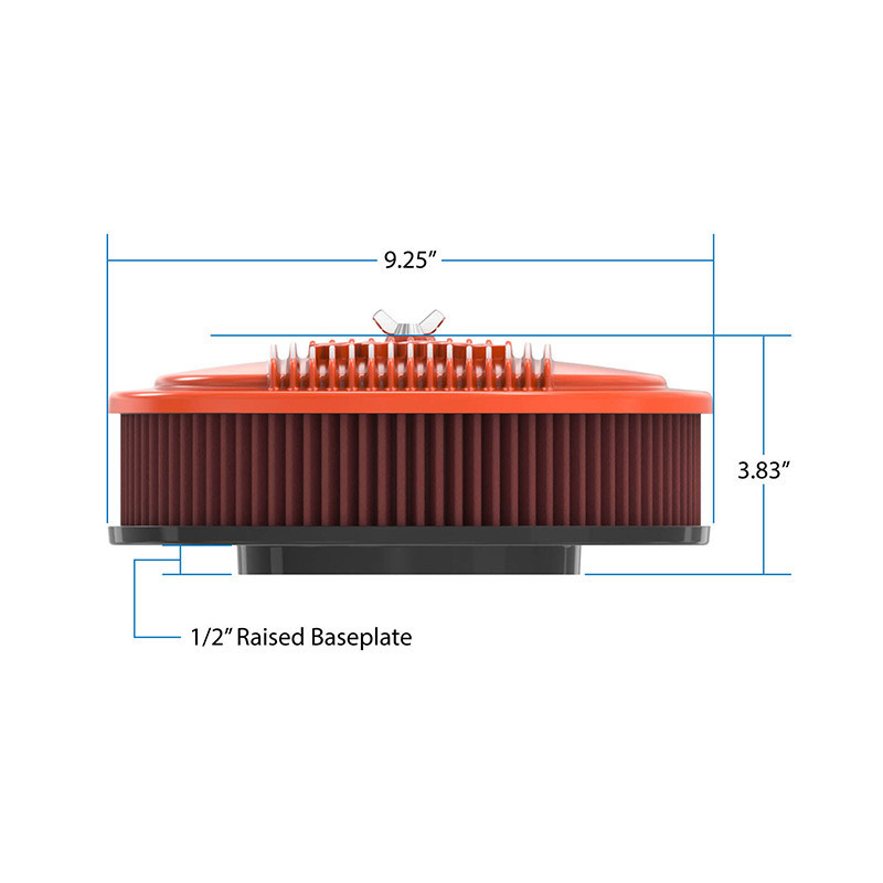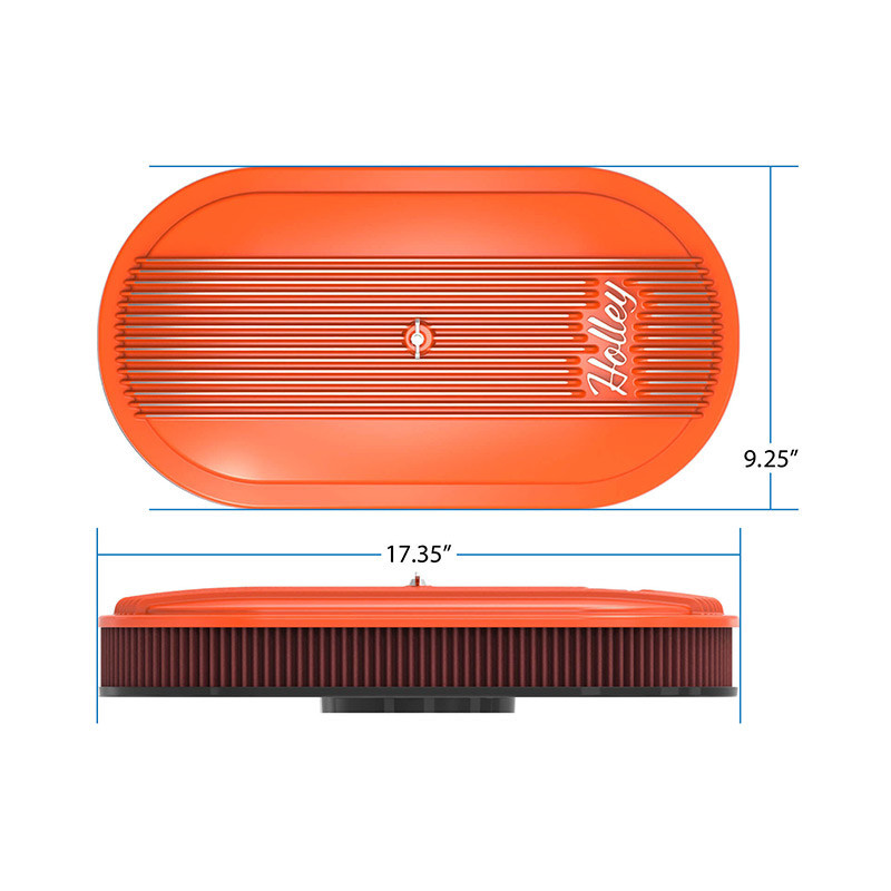 The oversized air cleaner look was king in the muscle car era, and were taking your Regals engine bay styling back to that nostalgic time with these Holley Vintage Series Oval Air Cleaner assemblies. Each air cleaner assembly includes a durable cast aluminum Vintage Series finned lid, a stamped steel 1/2 inch raised baseplate, a 2.5 inch tall premium washable and reusable filter element, and all hardware needed for easy installation. These oversized oval air cleaner assemblies dwarf the competition with their size - measuring at 17 inch long x 9 inch wide - which will make your engine bay stand out in a crowd of stale old oval air cleaners. The included stamped steel baseplate is designed to fit single 4-barrel carburetors with a standard 5-1/8 inch diameter neck, and the 1/2 inch raise is enough to clear throttle linkages, carburetor bowls, and distributors without any worry of interference.Features:Cast aluminum lid construction with stamped steel baseplate for optimal durability1/2 inch raised baseplate fits single 4-bbl carburetor setups with a 5-1/8 inch diameter neck and clears standard throttle linkages with easeOversized oval shape gives a true old school feel to your engine bay that can