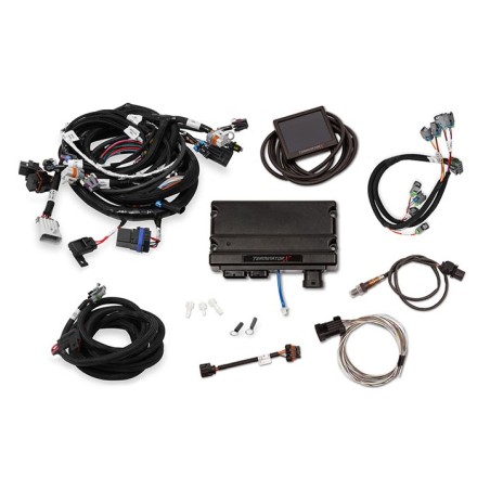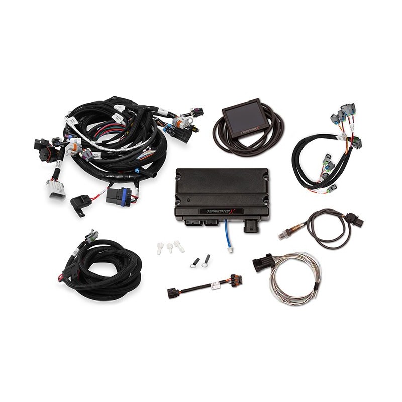Take control of your LS engine with Holley EFI Terminator X! Don't settle for a junkyard ECU with a cumbersome tuning interface when you can have complete control of your engine, self-learning fuel strategies and the proven, race-winning technology of Holley EFI at a budget-friendly price! Holley EFI Terminator X features real-time fuel learn, high impedance injector drivers, an integrated 1bar MAP sensor, and 4 programmable inputs and outputs. The inputs and outputs are ideal for electric fans, boost control solenoids, progressive nitrous control, and much more. Holley EFI Terminator X comes fully loaded with base maps for common LS engine combinations to get you out of the garage and on the road/track fast. The 3.5 IN touch screen LCD handheld contains an easy to use calibration wizard as well as tuning and gauge display functions. Also included is Holley EFI's industry-leading, easy to use software suite that allows full laptop access for advanced users. Whether you are building a budget beater or a boosted race car, Holley EFI Terminator X has the features and technology you need at a price that won't break the bank!Features:For GM LS1/LS6 engines with 24x crank reluctor - with EV6 Injectors.Real-Time fuel map learn, takes the guess work out of tuning your base fuel table.High Impedance Injector Drivers will safely power most Stock LS injectors, and Holley EFI Injectors. Injector support chart provided in the instructions (Will not control Low Impedance Injectors)All of the new Holley EFI Terminator X systems utilize the Bosch LSU 4.9 wideband to relay AFR information to the ECU for accurate reading and precise tuning control.On-Board 1bar MAP sensor, is perfect for N/A or Nitrous engine combos. If your combination requires a 2+Bar, we recommend GM 12592525, and our adapter part number 558-416.MAP Sensor vacuum hose adapters (1/8th – ¼ and 3/16ths)4 Inputs – 12v, Ground, 5v, and Frequency, for things such as additional pressure sensors, or activation triggers for nitrous activation, or a trans brakeBoost Control – Boost vs Time, Boost vs Gear, Boost vs RPM, Boost vs Speed, Boost SafetiesNitrous Control – Single Channel of Wet or Dry, Progressive or Non-Progressive, Rich/Lean Safeties, and target Closed Loop AFRAdvanced Tables – 4x 1D Tables, 1x 1D per Gear Table, 4x 2D Tables, 1x 2D per Gear Table, can be used for any custom tables you can dream up, such as Flex Fuel Sensor Offset Table, or a custom fuel or oil pressure safety!On-Board Diagnostic LEDS for: ECU Power – Engine Run – Wideband Status – TPS Calibration – Crank Signal –Cam Signal. Allow you to identify any Critical engine issues at a glanceThe included 3.5 IN Touchscreen Handheld contains a calibration wizard, that allows you to quickly build a base tune for any LS engine. Additionally the handheld provides internal data-logging and a fully customizable gauge display.The compact ECU size allows you to mount it virtually anywhere. Remember, diagnostic LEDS must face up!Plug and play compatible with more Holley EFI accessories such as; analog style gauges, shift lights, various modules, and coming soon, 12.3" digital dash support!Free EFI Tuning Software for complete control of your Holley EFI Terminator X power plantIncludes: 24x LS Engine Main Harness - EV6 Injector Harness - Holley EFI Terminator X ECU - ECU Main Power Harness - Bosch LSU 4.9 Wideband Oxygen Sensor - Input/Output Harness - and assorted vacuum adapters.