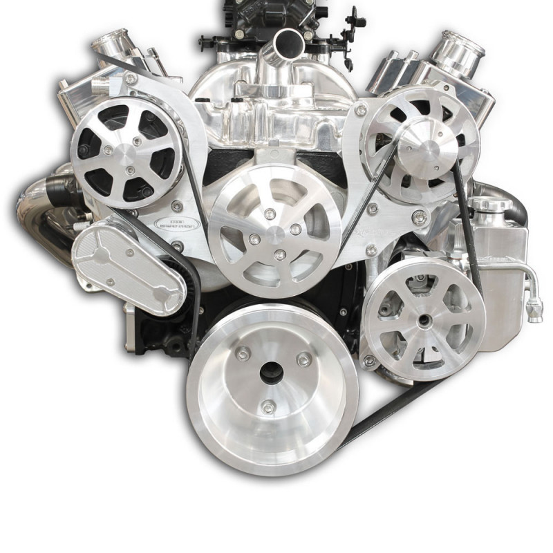 S-Drive + Eight rib pulley systems for Regal have a contact patch that is 33% wider than a standard six rib belt, the eight rib improves belt traction which limits slippage in higher horsepower applications and can handle increased torque loads of 33%. The larger eight rib belt also greatly reduces the chances of Span Vibration(belt whip/belt waves) which will have an improved life. The drive system's brackets and pulleys are CNC machined from high quality aluminum. Serpentine Drive Plus pulley systems also include all of the necessary stainless steel fasteners as well as the highest quality, name-brand components including Edelbrock/Tuff Stuff water pumps, Powermaster alternators, Gates tensioner and serpentine belts, Sanden style A/C compressors, and Maval power steering pumps. Complete system with air conditioning, 140 amp alternator, Aluminum Water pump, and a billet aluminum attached Power Steering reservoir. Raw machined finish.