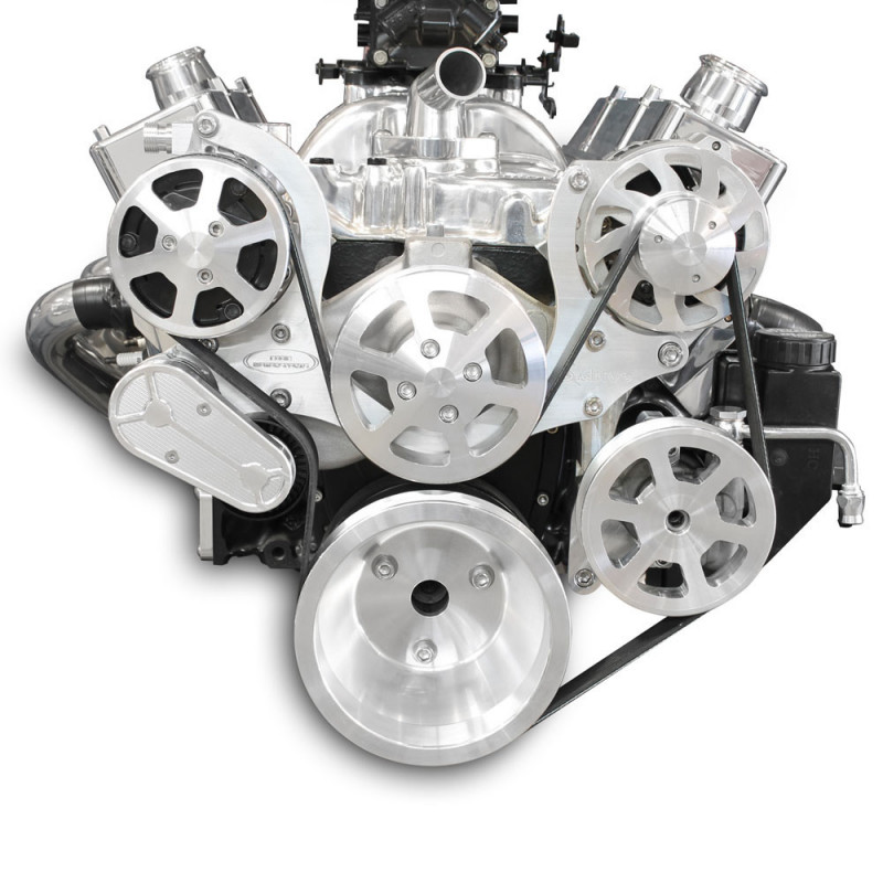 S-Drive + Eight rib pulley systems for Regal have a contact patch that is 33% wider than a standard six rib belt, the eight rib improves belt traction which limits slippage in higher horsepower applications and can handle increased torque loads of 33%. The larger eight rib belt also greatly reduces the chances of Span Vibration(belt whip/belt waves) which will have an improved life. The drive system's brackets and pulleys are CNC machined from high quality aluminum. Serpentine Drive Plus pulley systems also include all of the necessary stainless steel fasteners as well as the highest quality, name-brand components including Edelbrock/Tuff Stuff water pumps, Powermaster alternators, Gates tensioner and serpentine belts, Sanden style A/C compressors, and Maval power steering pumps. Complete system with air conditioning, 140 amp alternator, Aluminum Water pump, and a plastic attached Power Steering reservoir. Raw machined finish.