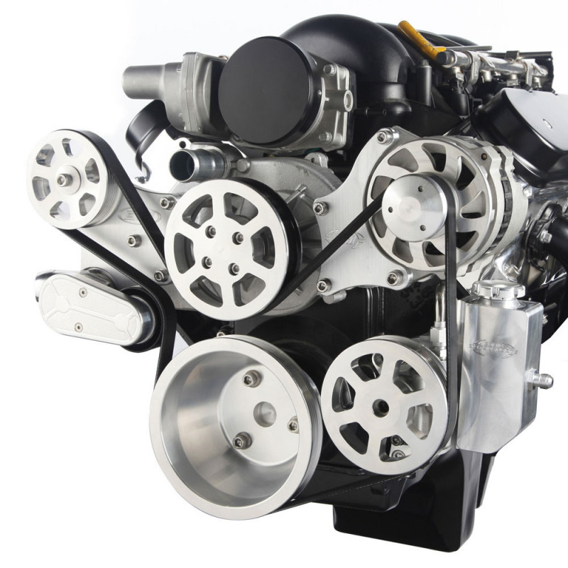 S-Drive + Eight rib pulley systems for Regal have a contact patch that is 33% wider than a standard six rib belt, the eight rib improves belt traction which limits slippage in higher horsepower applications and can handle increased torque loads of 33%. The larger eight rib belt also greatly reduces the chances of Span Vibration(belt whip/belt waves) which will have an improved life. The drive system's brackets and pulleys are CNC machined from high quality aluminum. Serpentine Drive Plus pulley systems also include all of the necessary stainless steel fasteners as well as the highest quality, name-brand components including Edelbrock/Tuff Stuff water pumps, Powermaster alternators, Gates tensioner and serpentine belts, and Maval power steering pumps. The system comes without air conditioning, but includes a 140 amp alternator, Aluminum Water pump, and a billet aluminum attached Power Steering reservoir. Bright protective clear coat finish.