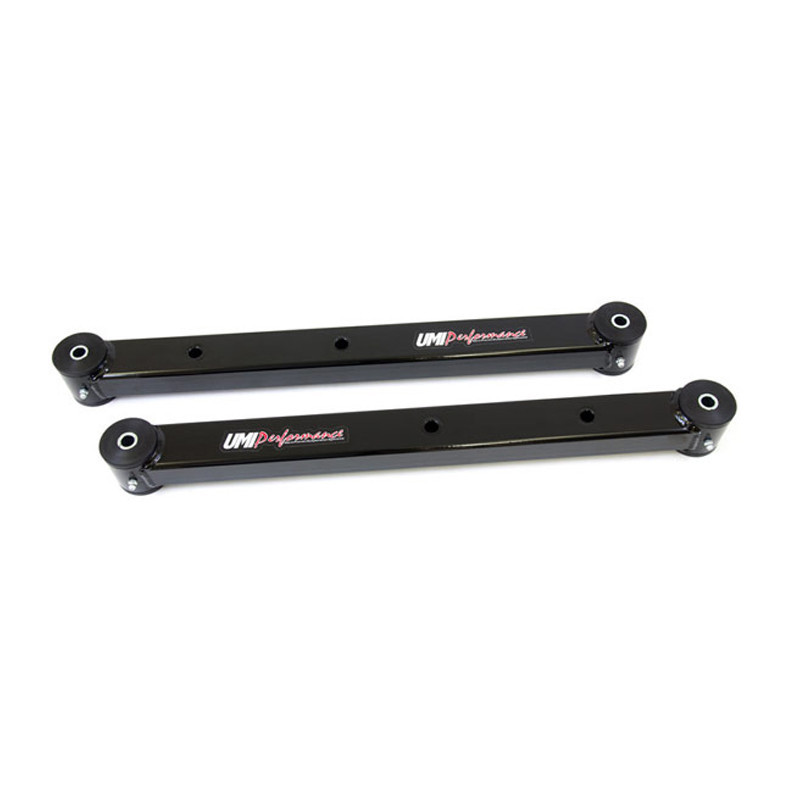 UMI's boxed rear lower control arms are a bulletproof addition to your car. Suitable for street, strip or corner carving, these arms minimize suspension deflection for a crisp handling setup and less wheel hop. Sway bar mounting holes are reinforced with TIG welded sleeves to allow factory style sway bar mounting, including UMI's popular 1 inch version. UMI's boxed control arms are CNC machined for accuracy and assembled with high quality greaseable polyurethane bushings.Features:2 in. x 1-1/2 in. x 1/8 in. wall mild steel rectangular tubingCNC machined for accuracy and consistencyMIG welded heavy duty bushing holdersGreaseable polyurethane bushings with zinc plated sleevesReinforced sway bar holes feature TIG welded reinforcement sleevesDurable and long lasting powder coat finishMade in Philipsburg, PA - USA