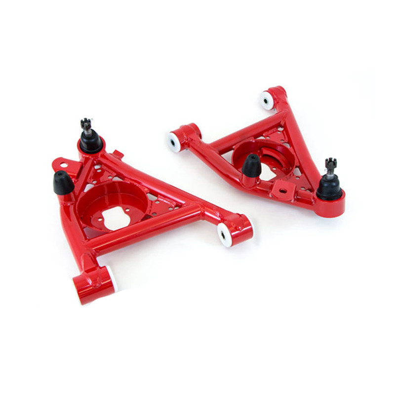 UMI's flagship 3032-1's are designed to make your Regal car handle like a slot car. These arms have two key features above and beyond UMI's already impressive fabricated lower a-arm; Delrin bushings and 1/2 inch taller-than-stock ball joints. The Delrin bushings provide bind-free, precise motion. This results in smooth travel and the ultimate in steering precision. The 1/2 inch taller lower ball joint lowers the car 1/2 inch, adds 1/2 inch of much needed spindle height and corrects bump steer all in one neat package. UMI lower a-arms are fabricated from DOM tubing with CNC machined tube ends for a precision fit. They are jig built to maintain accuracy and bolt on correctly every time. All critical areas are TIG welded for superior strength and a clean look. UMI's lower a-arms also feature improved ball joint angle for lowered vehicles and the design provides additional tire clearance. UMI-3032-1 lower a-arms include greaseable, UMI designed and manufactured Delrin bushings. Delrin bushings offer supremely smooth suspension action and precision operation while still providing some insulation from road noise. They come preloaded with polyurethane bump stops, and premium 1/2 inch taller-than-stock ball joints. UMI's extensive testing on the street, drag strip and skid pad ensures a quality product able to with stand all types of abuse. UMI lower a-arms are designed to work with factory springs, lowering springs and coil over kits without changing the a-arms. For exceptional handling and performance we recommend combining with UMI upper a-arms, UMI-3056-2 (corner carving, auto-x) or UMI-3056-3 (ultimate handling, road race). UMI Performance lower a-arms are shipped fully assembled and ready for installation. Designed and manufactured with pride in Philipsburg, PA USA.Features:Pro-Tour ready. Go out and WIN!UMI manufactured Delrin bushings for smooth motion and precise steering1/2 inch taller-than-stock premium ball joint for improved spindle height, lower center of gravity and reduced bump steerTubing is precision bent on a programmable tube bender and CNC machined for accuracyJig built and TIG welded for superior strength and a clean lookPolyurethane bump stopsSimply bolt-on and go. Fits factory spindle and works with factory springs, lowering springs and hybrid coilover kits (Viking, QA1)Durable red or black powder coat finishDesigned and manufactured with pride in Philipsburg, PA - USA