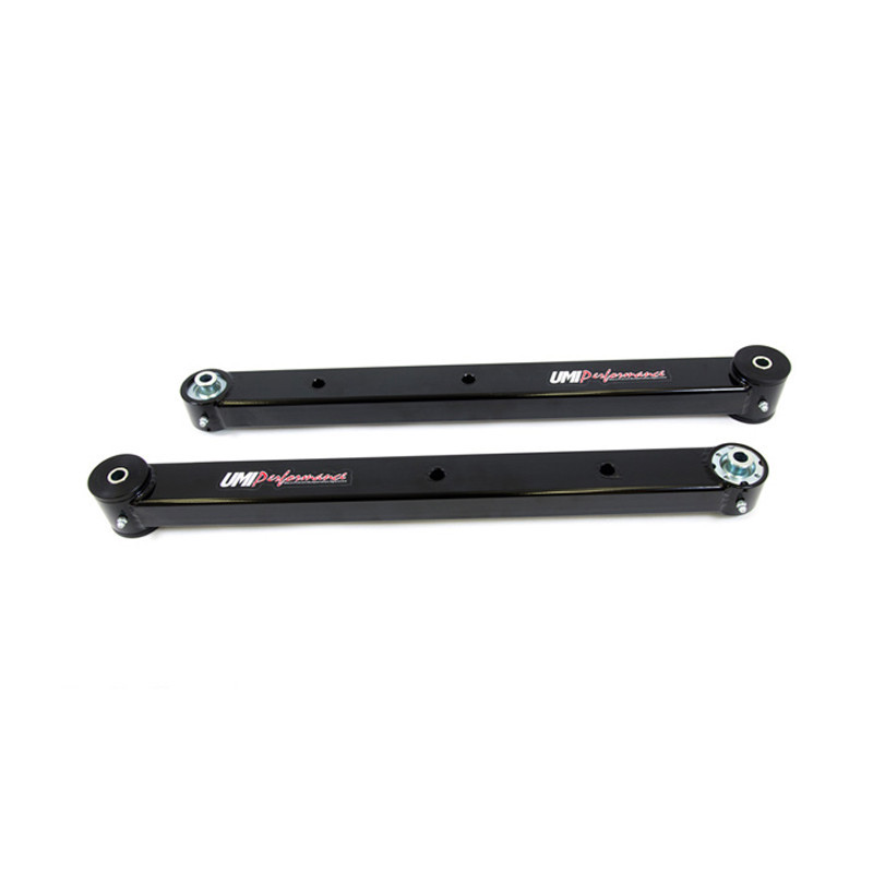 UMI's boxed lower control arms utilize our Roto-Joint technology for a bind free performance and quiet comfortable ride quality. The boxed control arms are fabricated from 0.120 inch wall thickness rectangular tubing, CNC machined drawn over mandrel bushing holders and MIG welded end caps to keep out unwanted road debris. Each control arm features the correct provisions for adding a stock or aftermarket rear sway bar, sway bar holes are reinforced with a 0.120 inch wall thickness steel sleeve that is TIG welded and sanded into place. The solid construction combined with the delrin lined Roto-Joints eliminate control arm flex and bushing deflection for improved traction and reduced wheel hop. The installed Roto-Joint is a pivot ball lined with a greaseable delrin race designed to offer 28 degrees of total unrestricted movement, more than adequate for a bind free, low friction operation. The Roto-Joint design improves performance over the factory rubber and aftermarket polyurethane bushings by allowing the suspension to articulate correctly, and provide precision handling. The installed UMI Roto-Joint allows rear end free movement when high handling, auto cross or road race is a concern while still being a 100% streetable setup. The installed delrin race, which lines the spherical ball, absorbs shock and road noise for a quiet and smooth operation on any street or track driven vehicle. This control arm set features polyurethane bushings on one end and UMI's swivel Roto-Joint on the other end. This set-up is designed for street performance and street enthusiast. The polyurethane bushing end is designed to be bolted to the vehicle chassis side while the Roto-Joint attaches to the rear end side. Since the polyurethane bushings are softer they are designed to absorb more road noise and shock before it enters the passenger compartment of the vehicle. All bushing ends and Roto-Joints are greaseable and low maintenance making an excellent street setup for your cruiser!Features:Constructed of 3 in. x 1-1/2 in. x 1/8 in. rectangular steel tubingMIG and TIG welded construction for superior strengthCNC machined for accurate tolerances and perfect fitSpherical Roto-Joints installedEnergy Suspension greaseable polyurethane bushingsReinforced sway bar holesShipped fully assembled and ready to installUses OEM hardwareBrilliant and durable powder coat finish